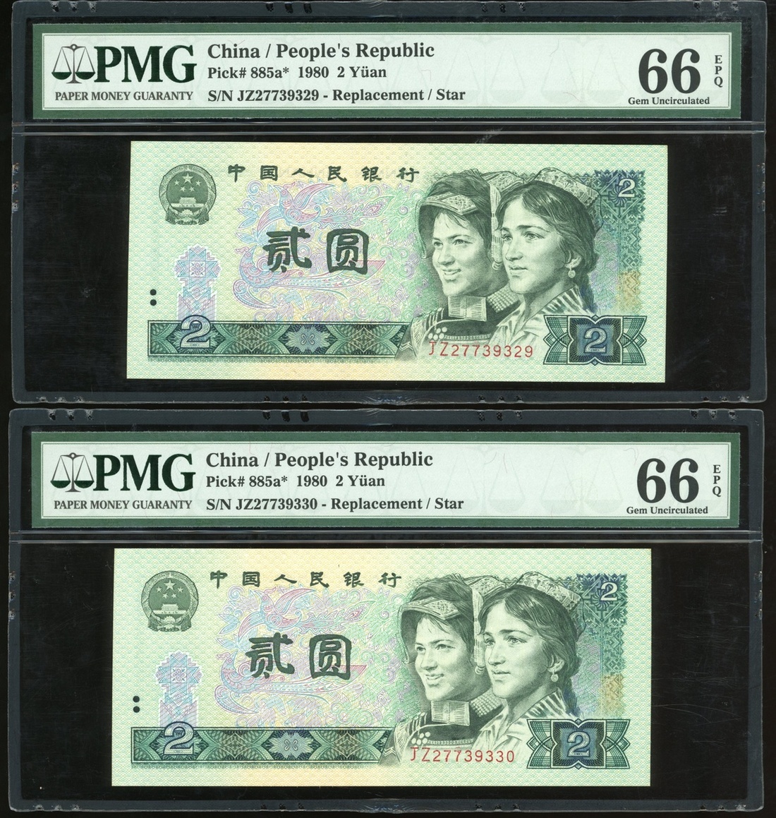 People's Bank of China, 4th series renminbi, 1980, a pair of 2 Yuan, consecutive replacement serial numbers JZ27739329-330,