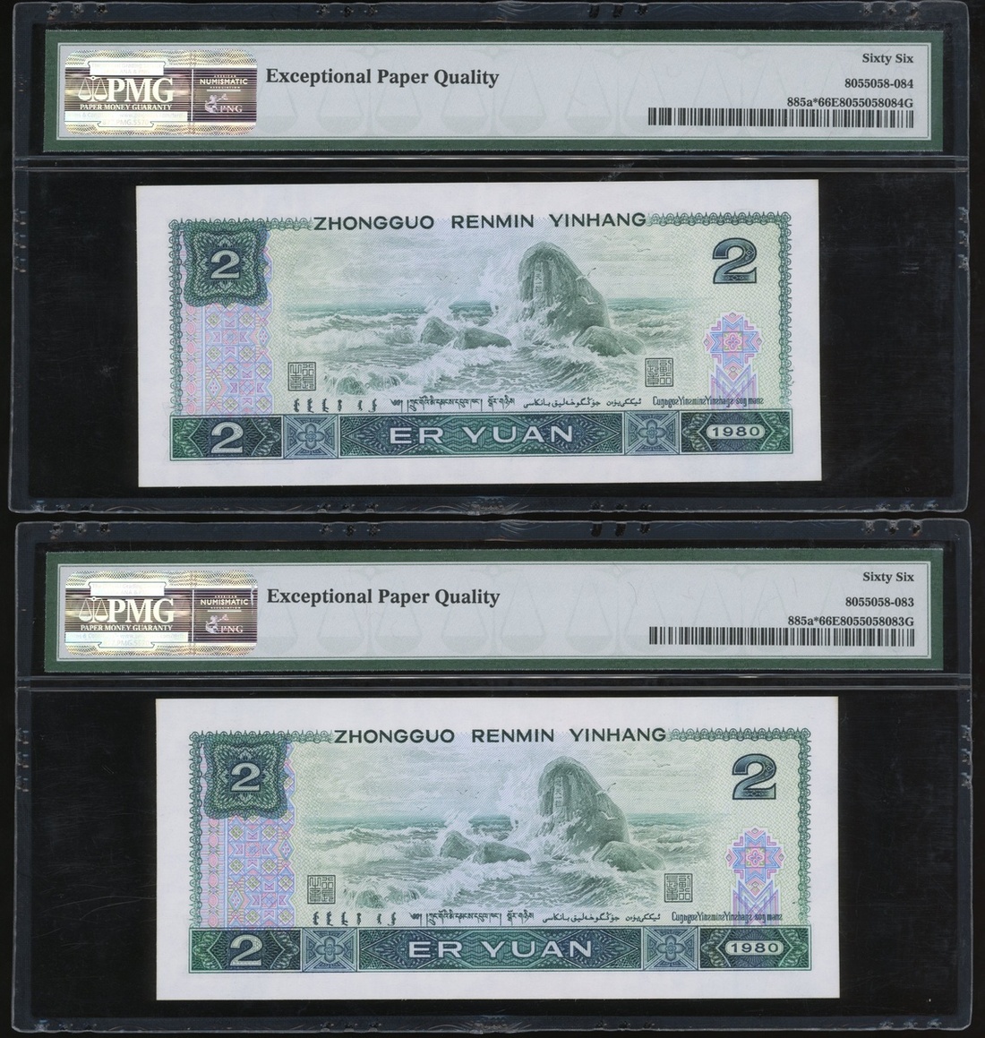 1980年中國人民銀行第四版人民幣5元連號一對,補 JZ27739329-330,均PMG 66EPQ