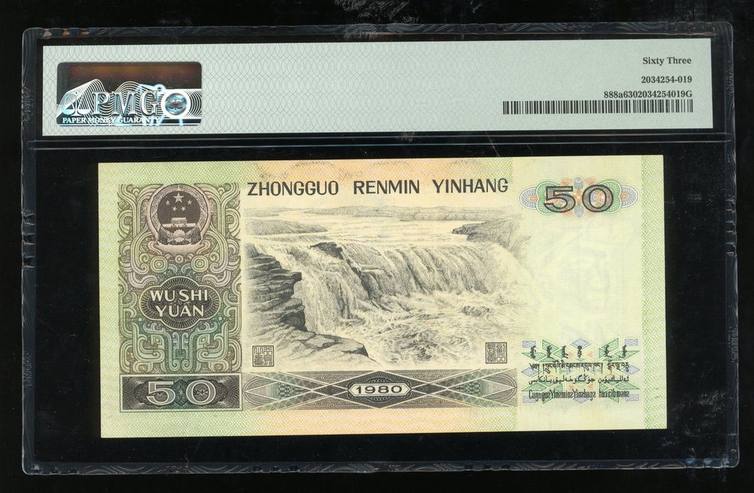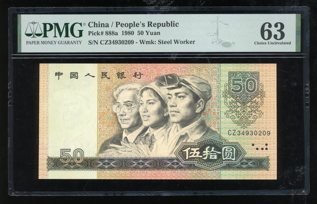 1980年中國人民銀行第四版人民幣50元,鍊鋼工人水印,編號CZ34930209,PMG 64