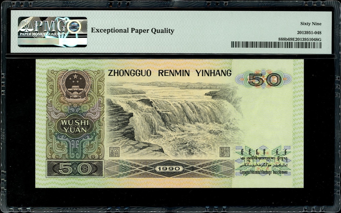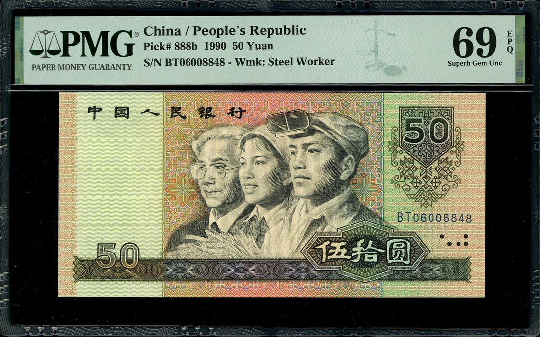 1990年中國人民銀行第四版人民幣50元,編號BT06008848,PMG 69EPQ,評分極高之一枚