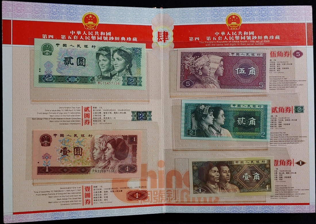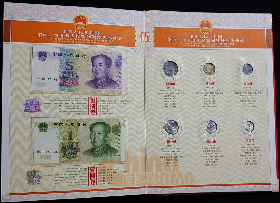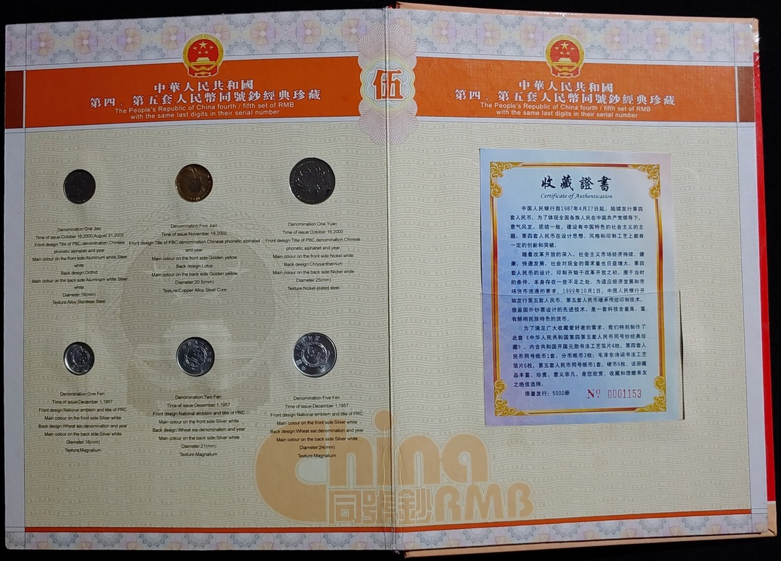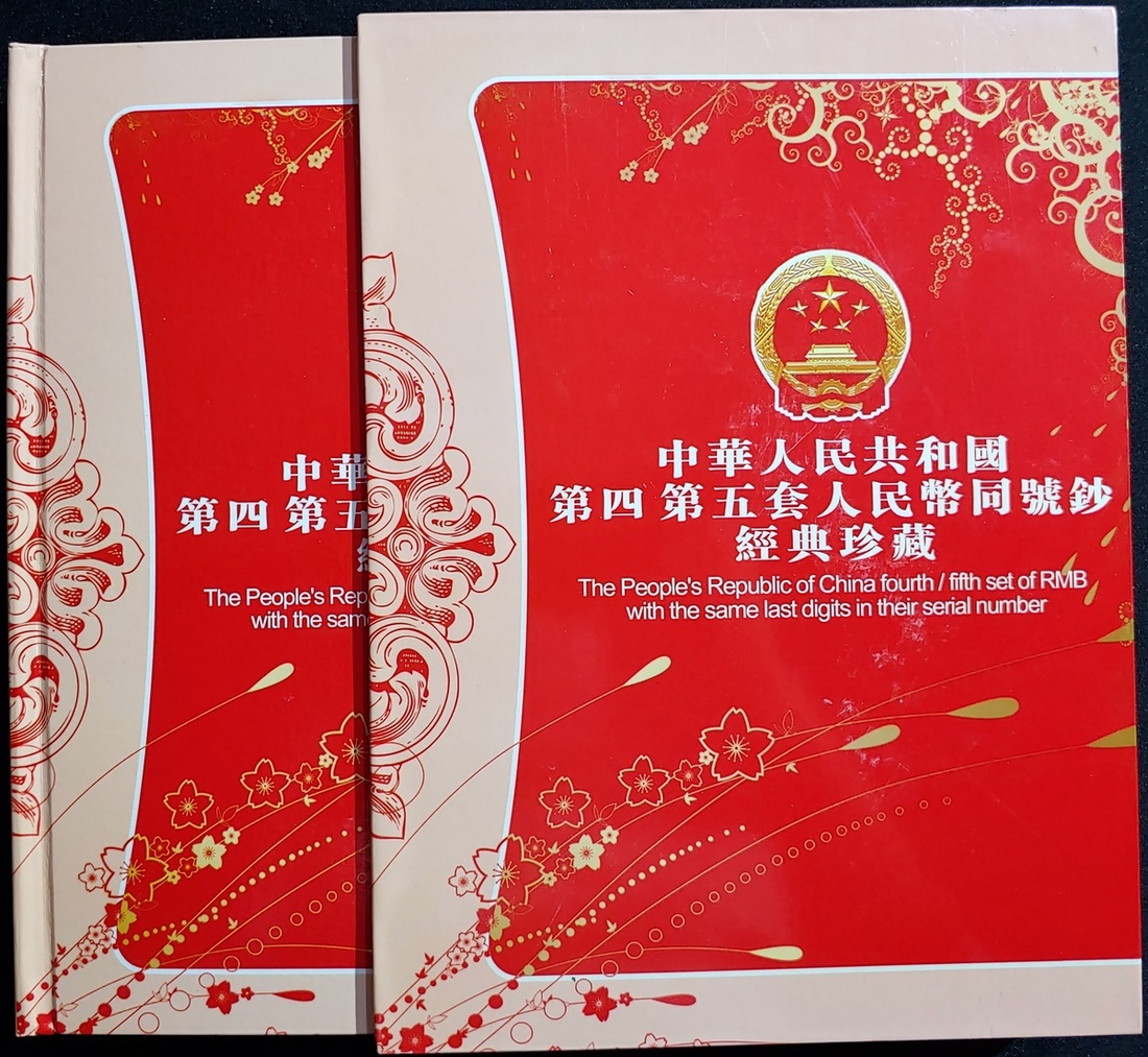People's Republic of China, a hard cover commemorative set for the 4th and 5th series renminbi with matching serials, includes 2nd series, 1 fen to 5 fen, roman serials, 4th series, 1 jiao to 100 Yuan, 5th series, 1 Yuan to 100 Yuan, and an uncirculated coin set from 1 fen to 1 Yuan,