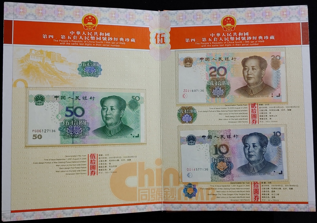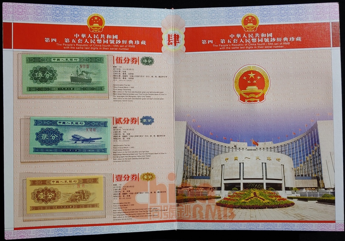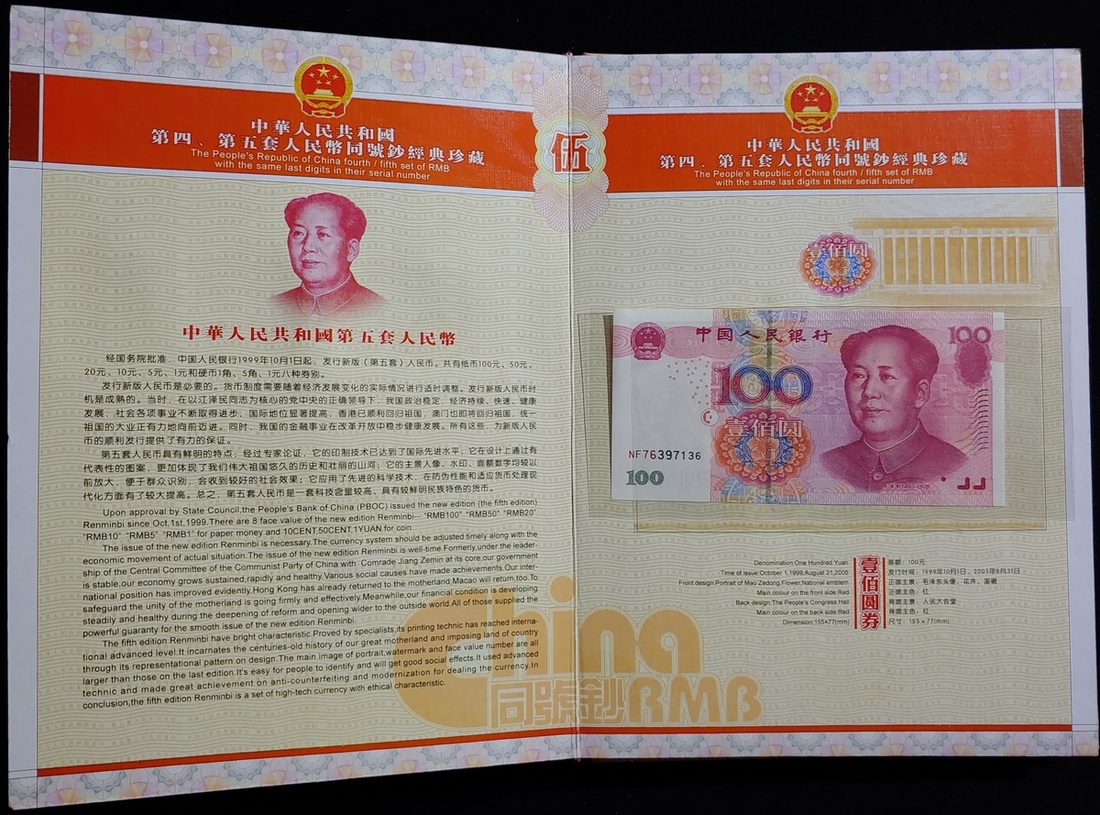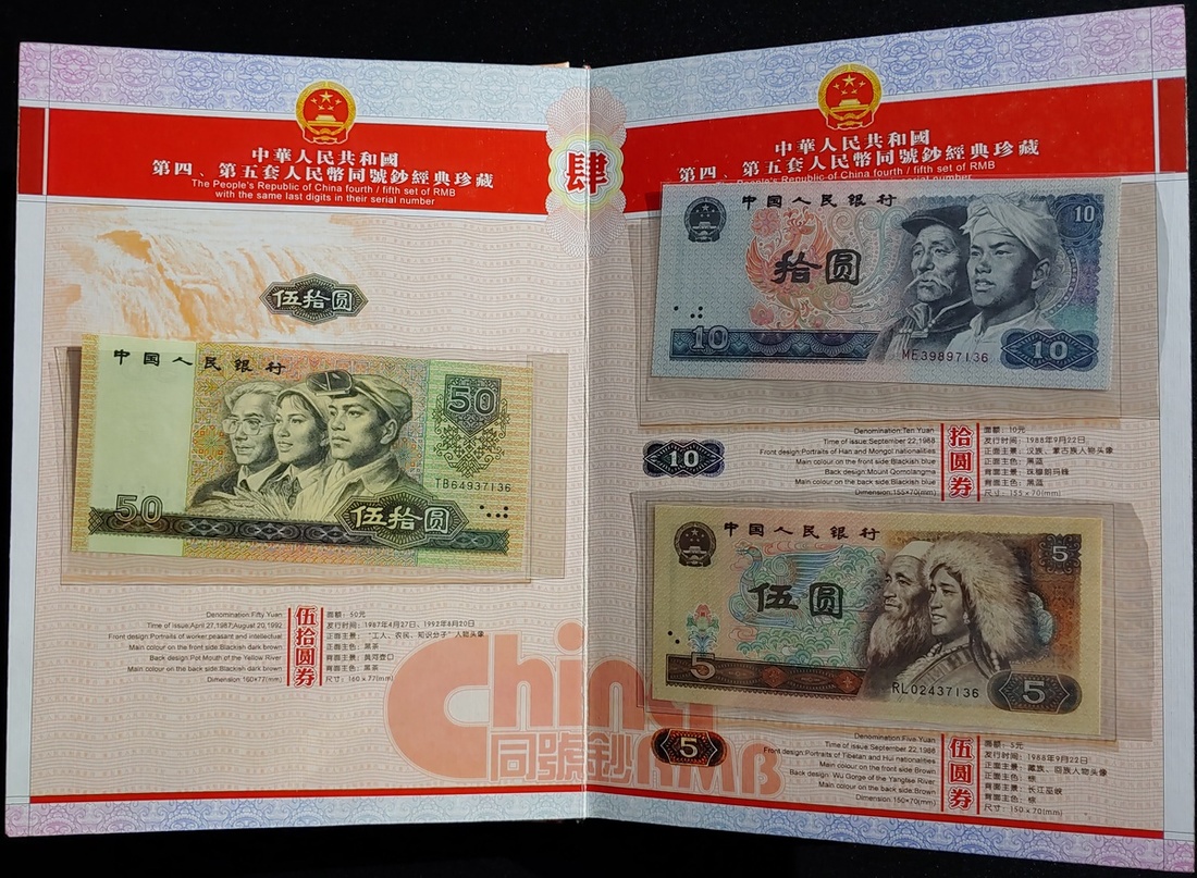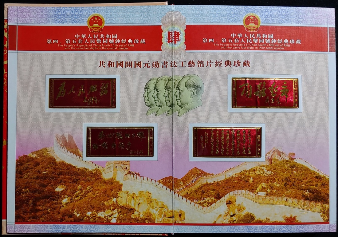 People's Republic of China, a hard cover commemorative set for the 4th and 5th series renminbi with matching serials, includes 2nd series, 1 fen to 5 fen, roman serials, 4th series, 1 jiao to 100 Yuan, 5th series, 1 Yuan to 100 Yuan, and an uncirculated coin set from 1 fen to 1 Yuan,