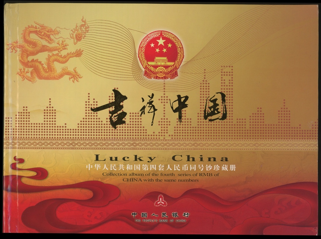 People's Bank of China, Collection Album of the Forth Series of RMB of China with the Same Numbers consists of 1 jiao, 2 jiao, 5 jiao, 1 yuan(3), 2 yuan(2), 5 yuan, 10 yuan, 50 yuan(2), 100(2), face value 168.88 yuan, also with 10x vouchers for food and cloth, 9x silver glited notes, 1x gold glited note, Uncirculated, in original booklet and certificate, #000606 .