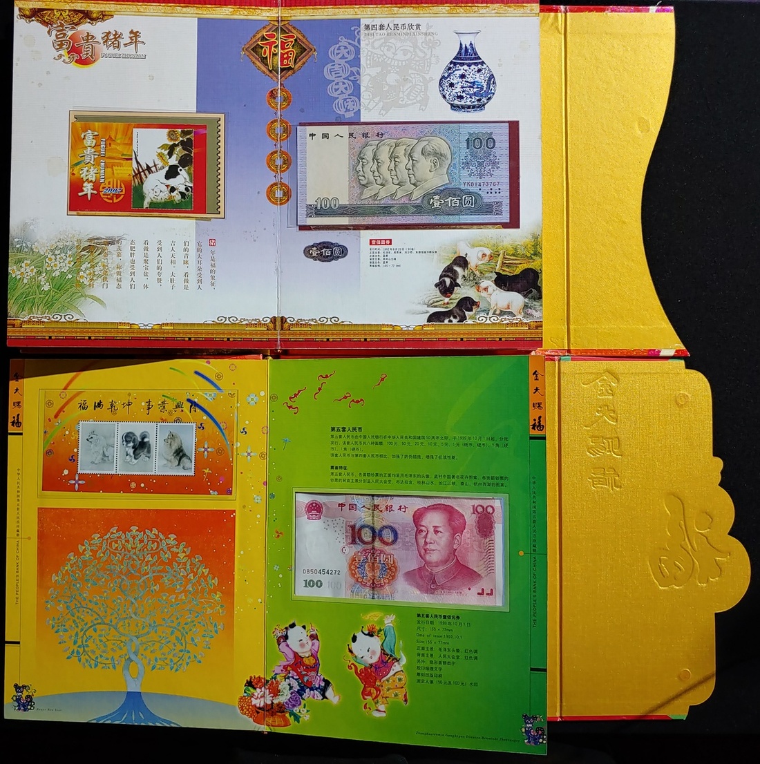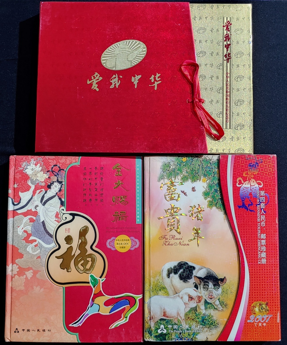 中國紀念幣三套,包括「富貴豬年」第四套人民幣、郵票珍藏冊、「金犬賜福」第五套人民幣珍藏冊、及1999年「愛我中華」紀念章一套,大致UNC,紙鈔帶微黃