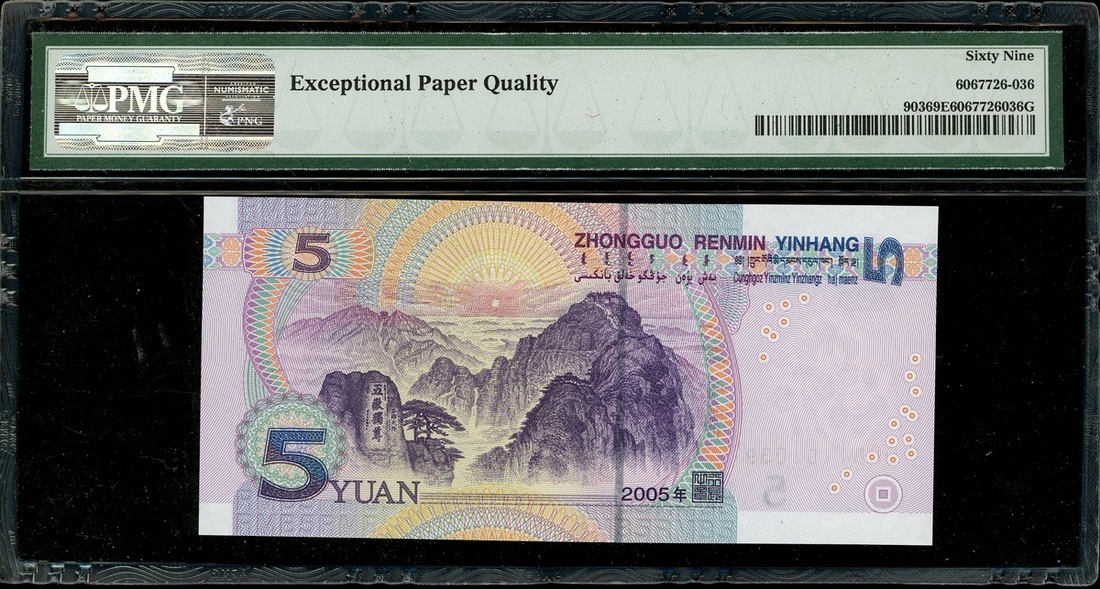 2005年中國人民銀行第五版人民幣5元,幸運號OO01101039,PMG 69EPQ,OO字軌貌似00號,讓人錯覺此為無字母字軌鈔票