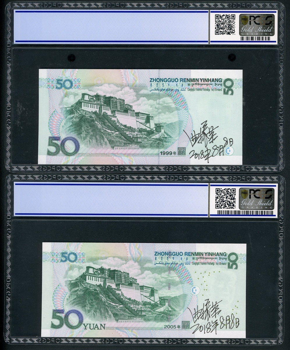 1995及2005年中國人民銀行第五版人民幣50元一對,編號II 10288586 及 JI 96567686,背有設計師簽名,分別PCGS Gold Shield 67OPQ 及 68OPQ