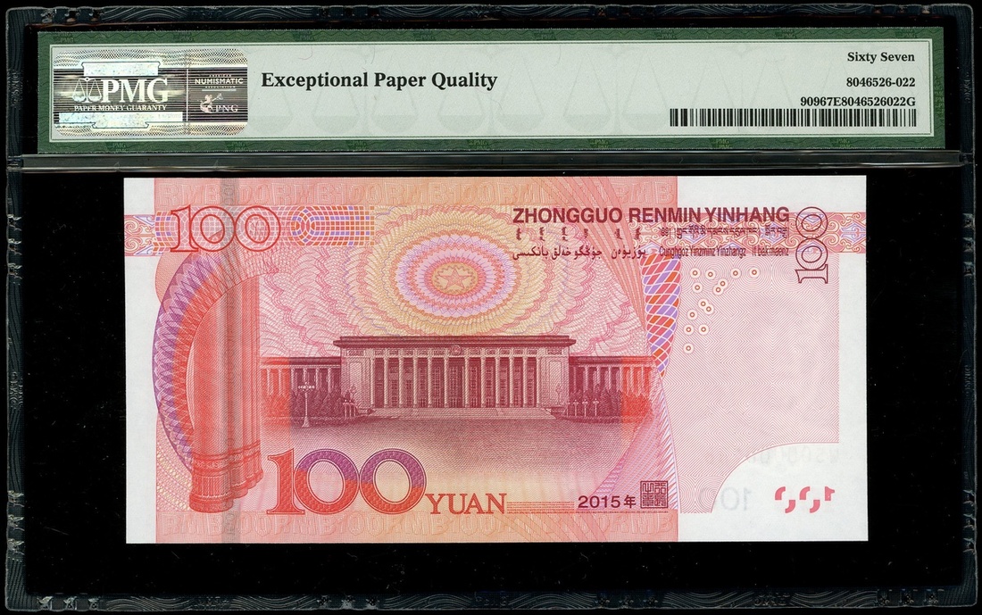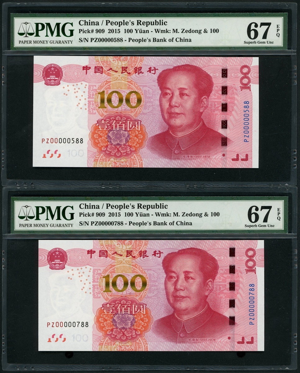 2015年中國人民銀行第五版人民幣100元一組3枚,細編號PZ00000588,PZ00000788 及 WS00000488,均PMG 67EPQ