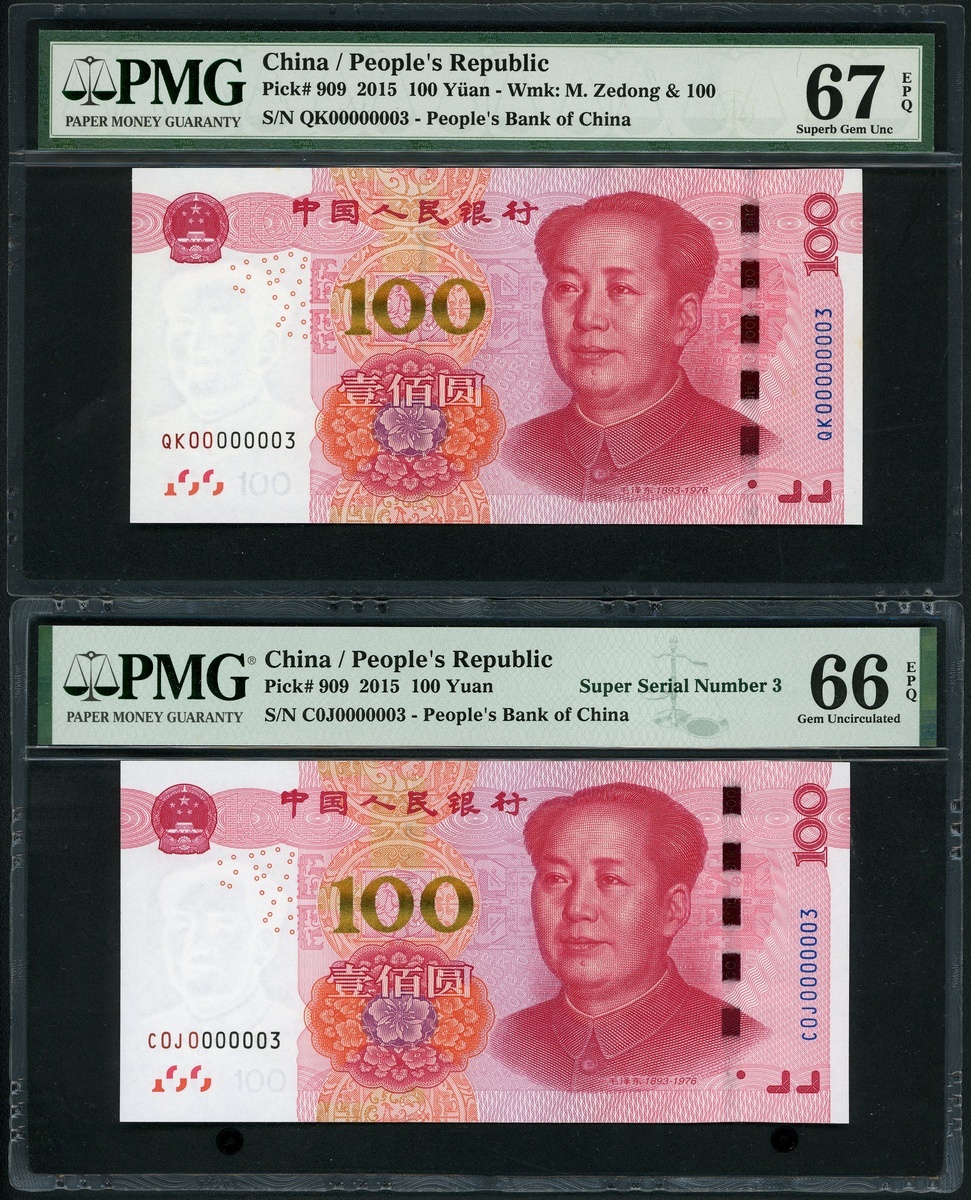 2015年中國人民銀行第五版人民幣100元一對,細編號QK00000003 及 C0J0000003,分別PMG 67EPQ 及 66EPQ