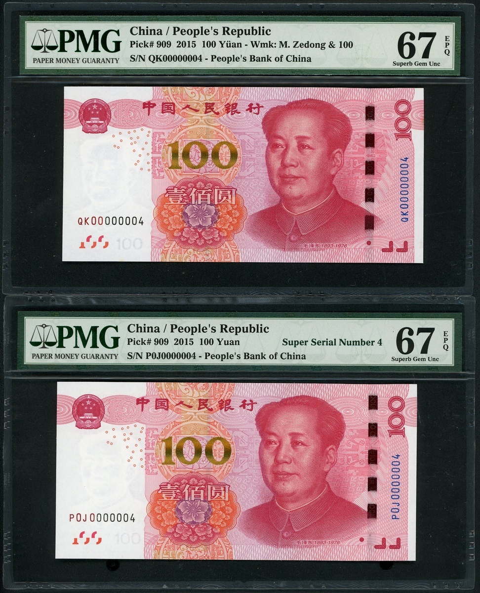 People's Bank of China, 5th series renminbi, 2015, pair of 100 yuan, low serial numbers QK00000004 and P0J0000004,