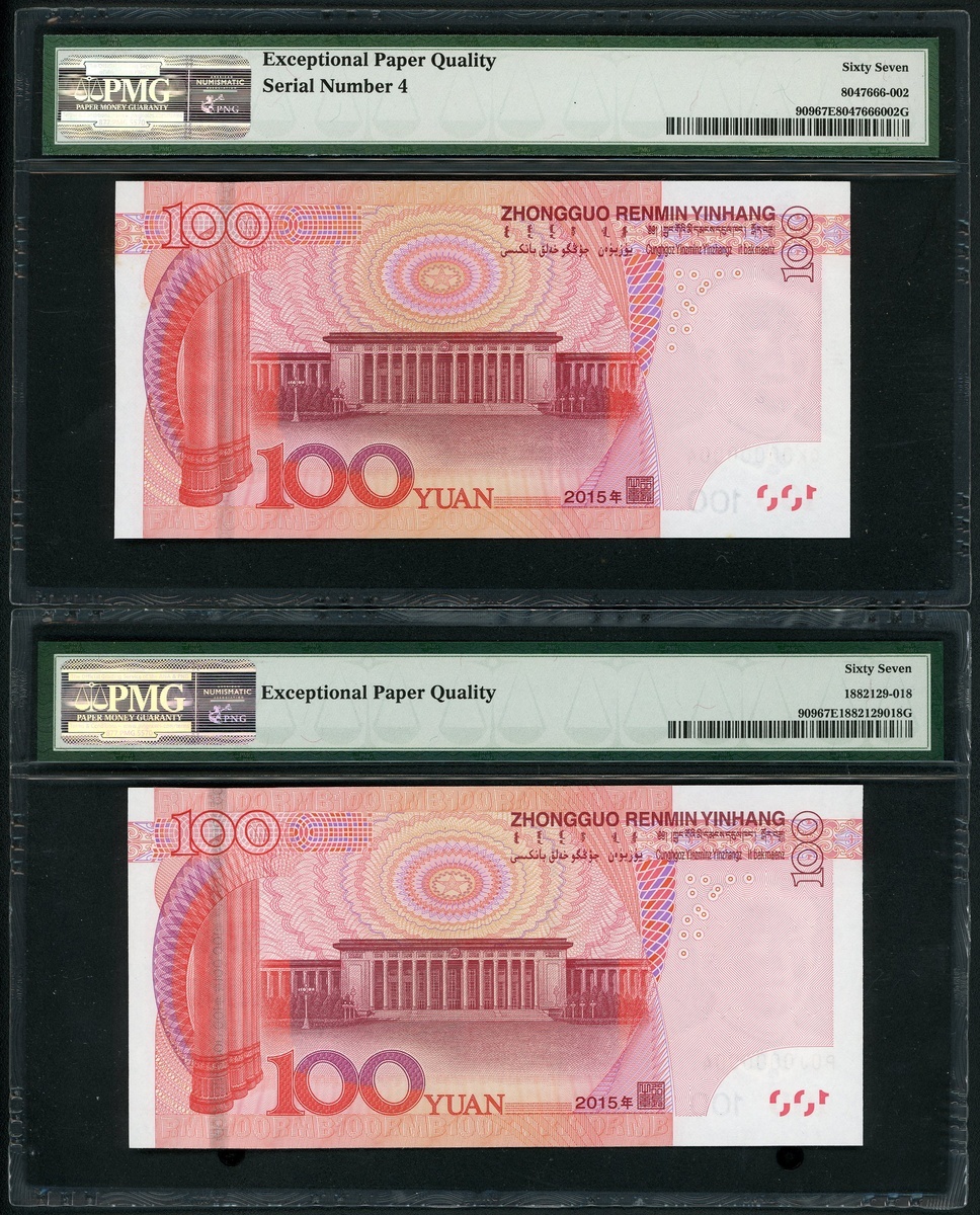 2015年中國人民銀行第五版人民幣100元一對,細編號QK00000004 及 P0J0000004,均PMG 67EPQ