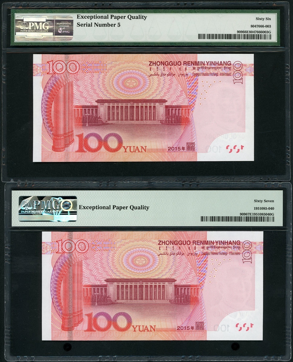 2015年中國人民銀行第五版人民幣100元一對,細編號QK00000005 及 M0U0000005,分別PMG 66EPQ 及67EPQ