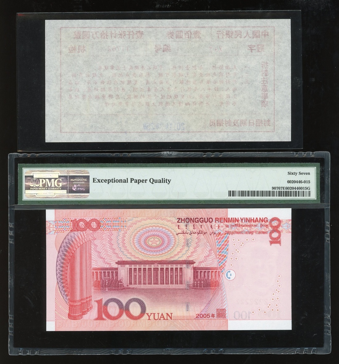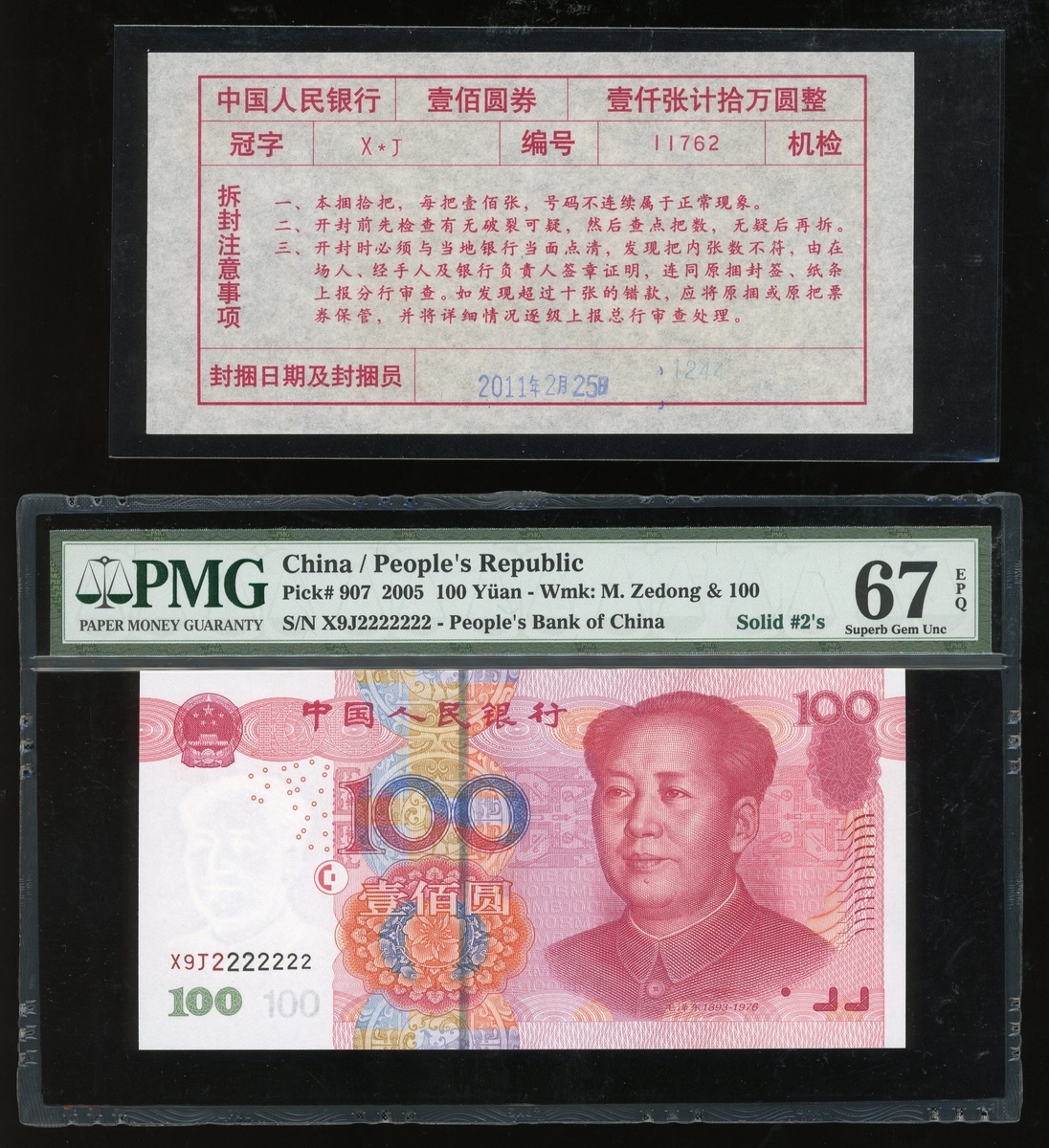 2005年中國人民銀行第五版人民幣100元連號10枚,編號X9J22222220-229,連銀行證書,全2評PMG 67EPQ,其餘UNC