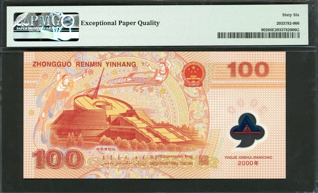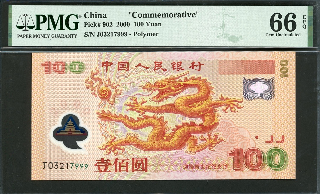 2000年中國人民銀行千禧龍鈔100元,編號J03217999,PMG 66EPQ