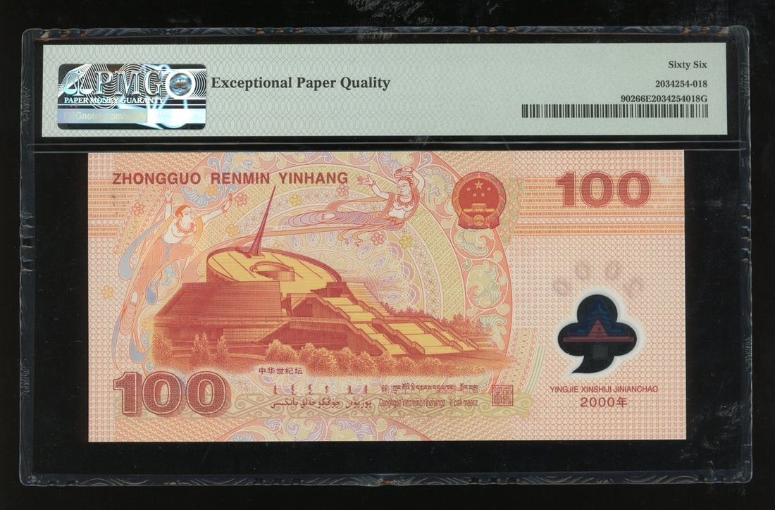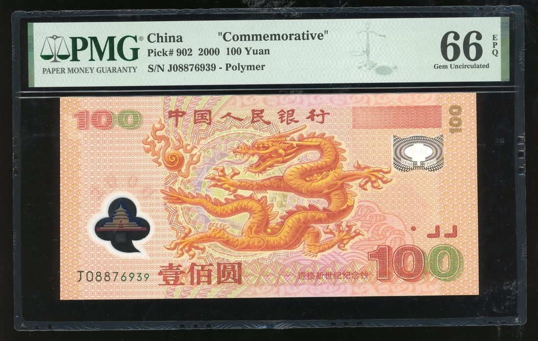 2000年中國人民銀行千禧龍鈔100元,編號J08876939,PMG 66EPQ