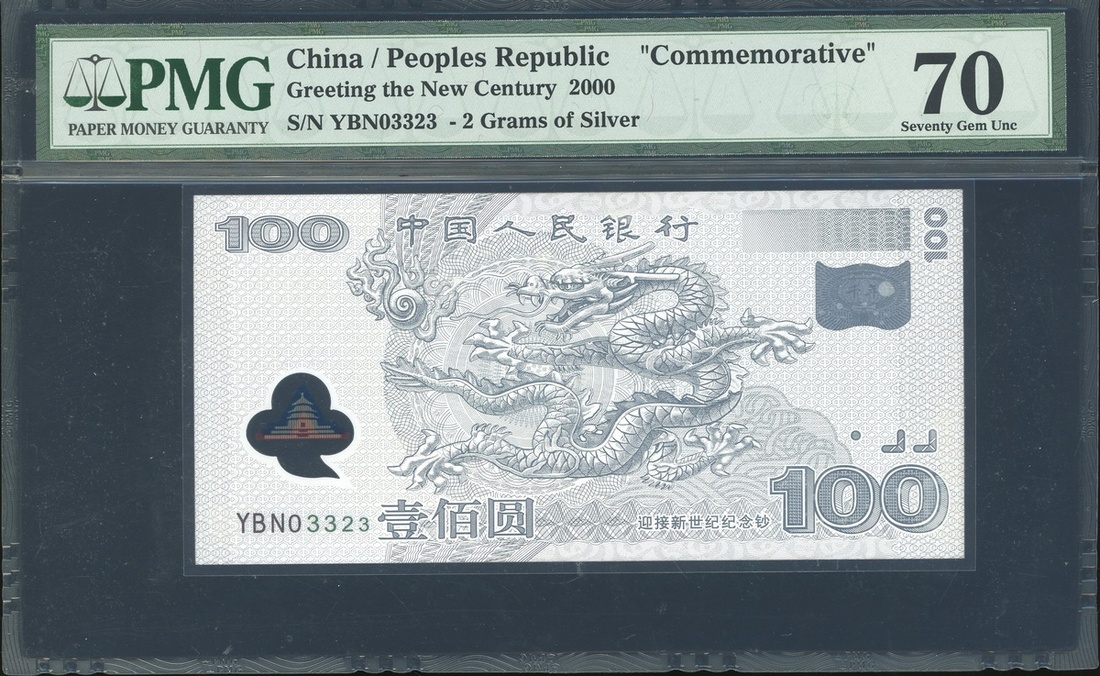 中國人民銀行千禧龍100元銀鈔,重2克,編號YBNO3323,PMG 70