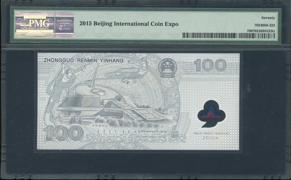 People's Bank of China, a 2 grams silver 100 yuan note, 'Commemorative of the New Century 2000', serial number YBNO3323, PMG holder 70, gem uncirculated.