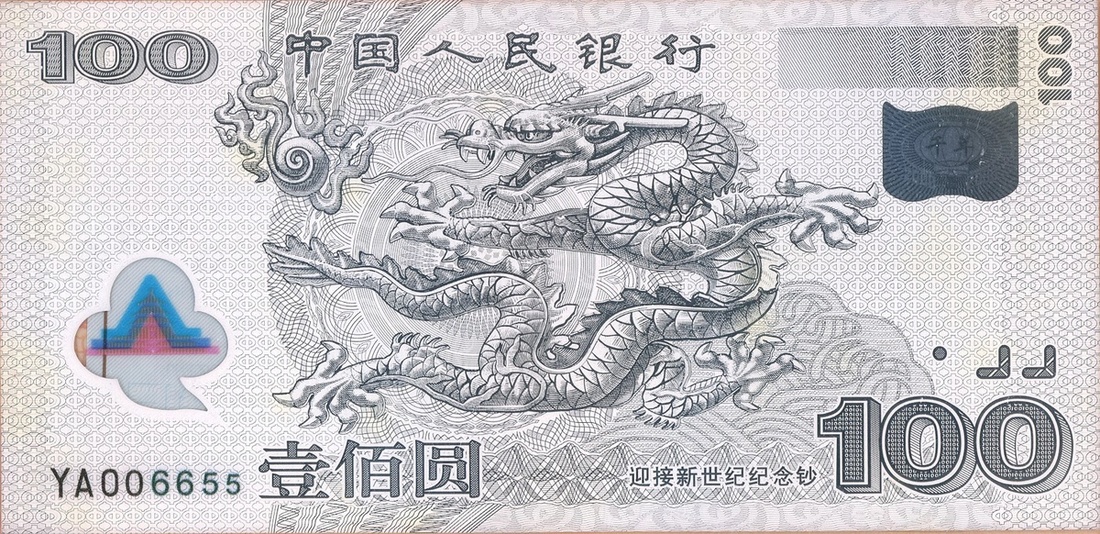 People's Republic of China, silver commemorative note for the new millenia, 2000, weighs 2g containing .999 silver, bears the same design as the issued note,