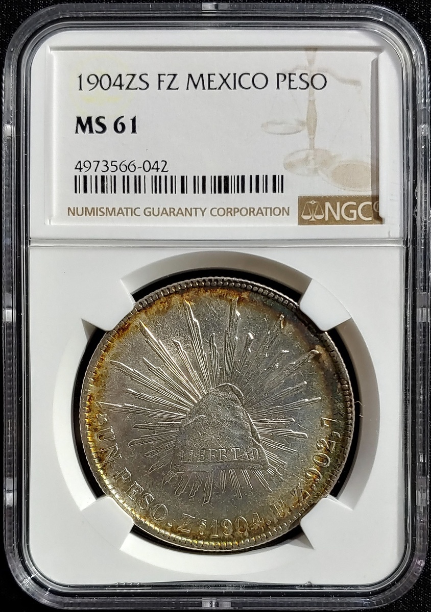 Mexico, silver peso, 1904-ZS FZ, NGC MS 61 with nice toning around the peripheries