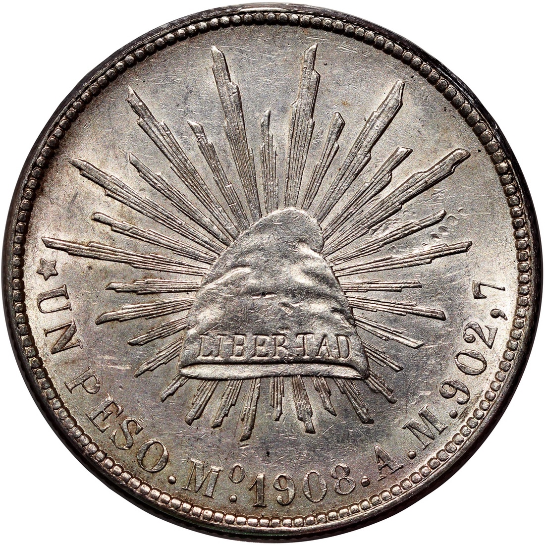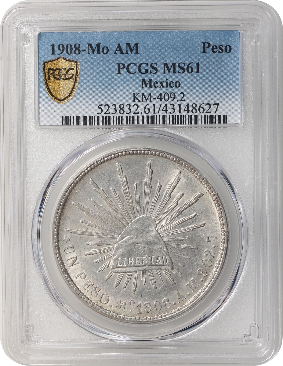 Mexico, silver Peso, 1908-Mo AM, (KM-409.2), PCGS MS61, #43148627.