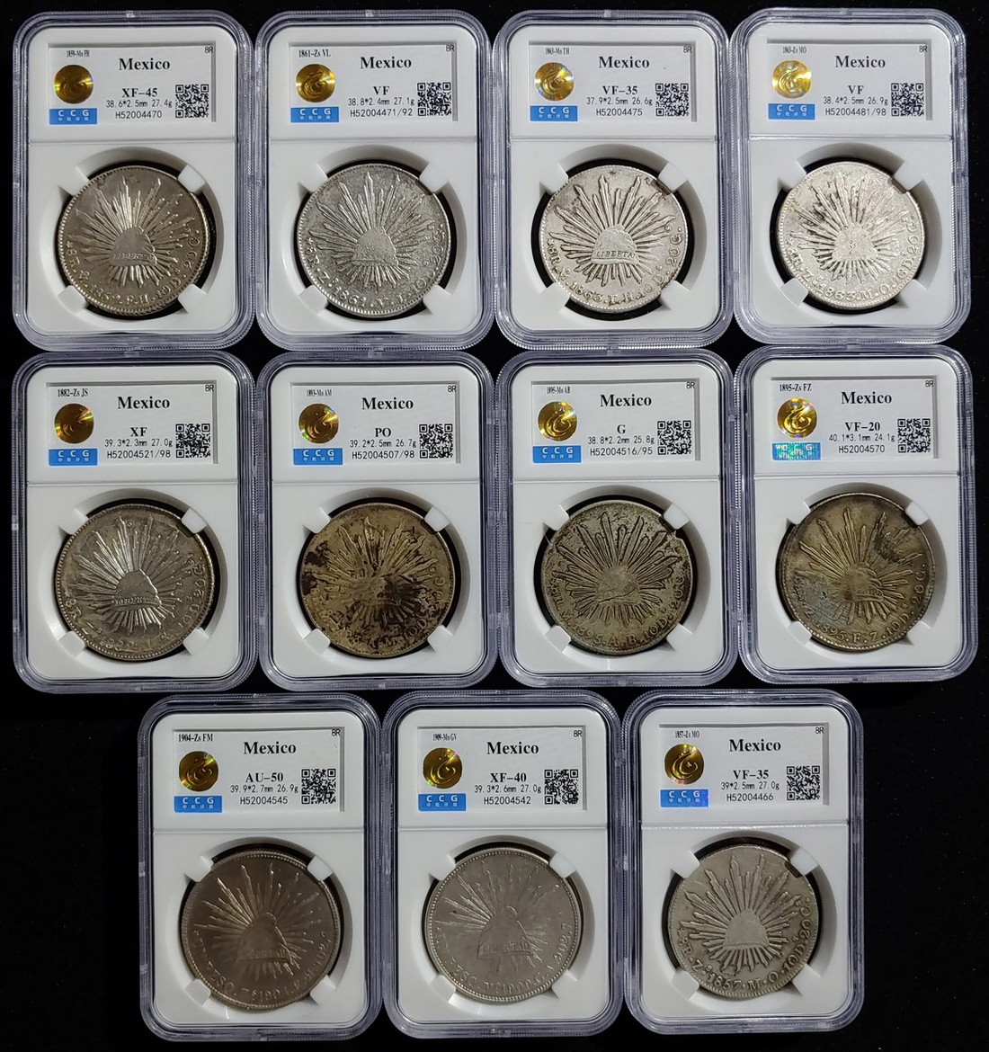 Mexico, group of 11, consisting of: 9x silver 8 reales, 1857-Zs MO, 1859-Mo FH, 1861-Zs VL, 1863-Mo TH, 1863-Zs MO, 1882-Zs JS, 1893-Mo AM, 1895-Mo AB and 1895-Zs FZ, also 2x silver 1 peso, 1904-Zs FM and 1909-Mo GV,