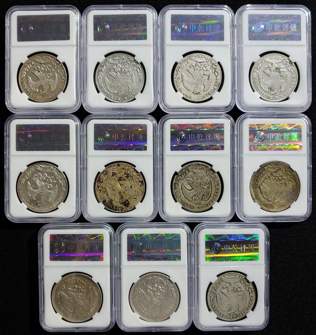 1857-1909年墨西哥八瑞爾鷹洋、壹比索銀幣一組九枚,均中乾評級,敬請預覽(9)