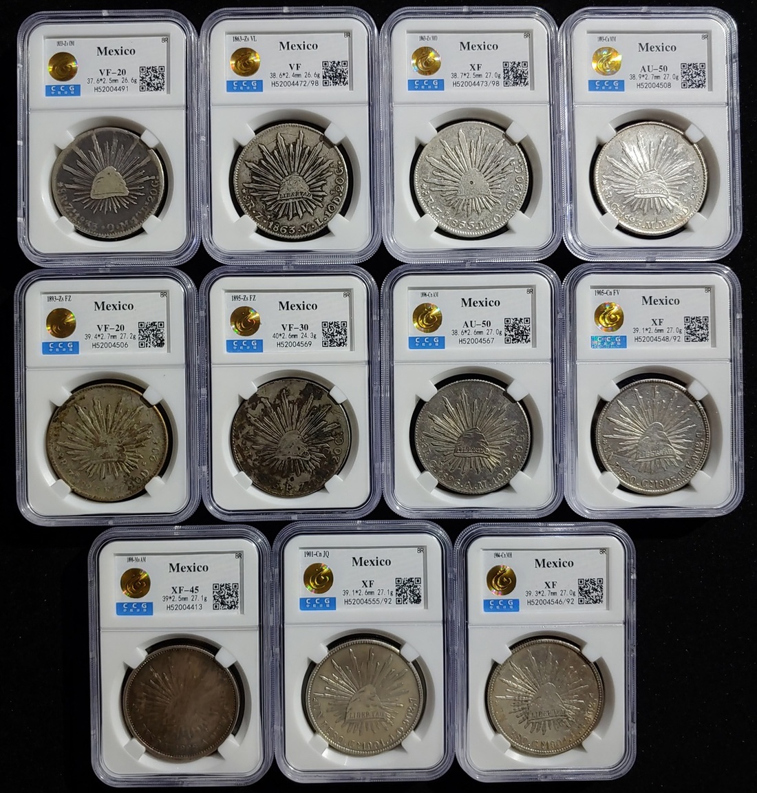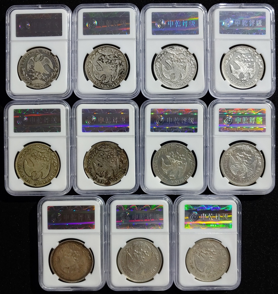 1883-1905年墨西哥八瑞爾鷹洋、壹比索銀幣一組十一枚,均中乾評級,敬請預覽(11)