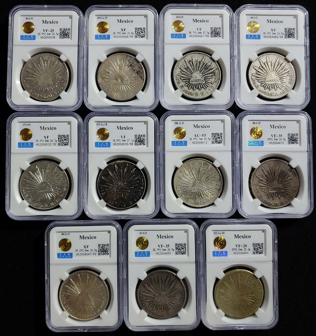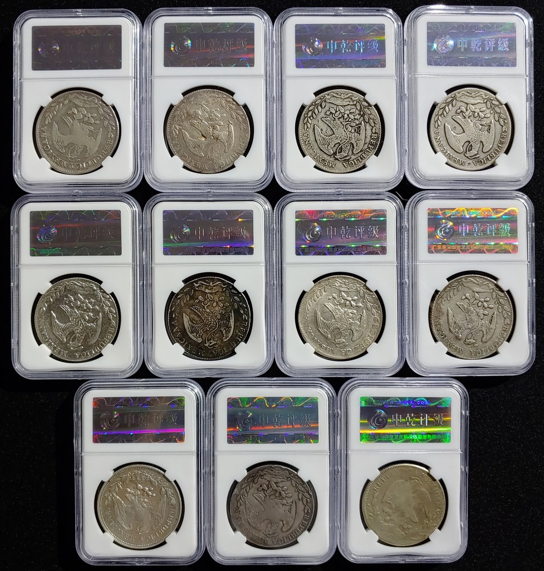 1831-1904年墨西哥八瑞爾鷹洋、壹比索銀幣一組十枚,均中乾評級,敬請預覽(10)