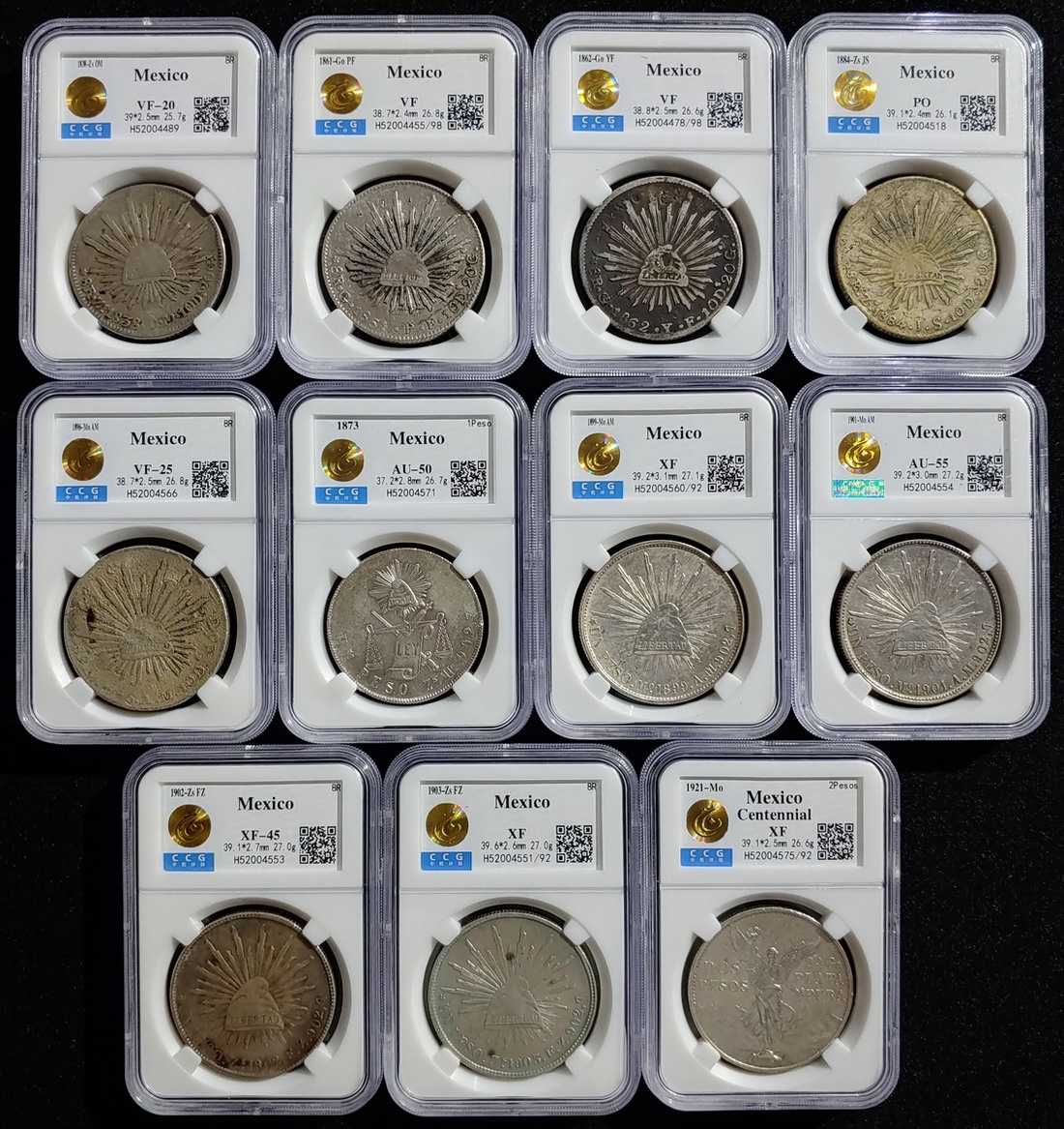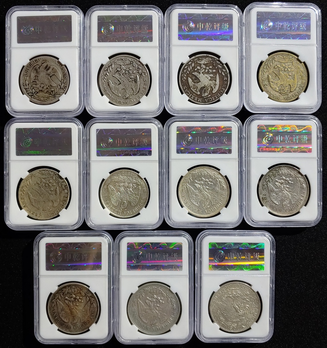 1838-1921年墨西哥八瑞爾鷹洋、壹比索銀幣一組十一枚,均中乾評級,敬請預覽(11)