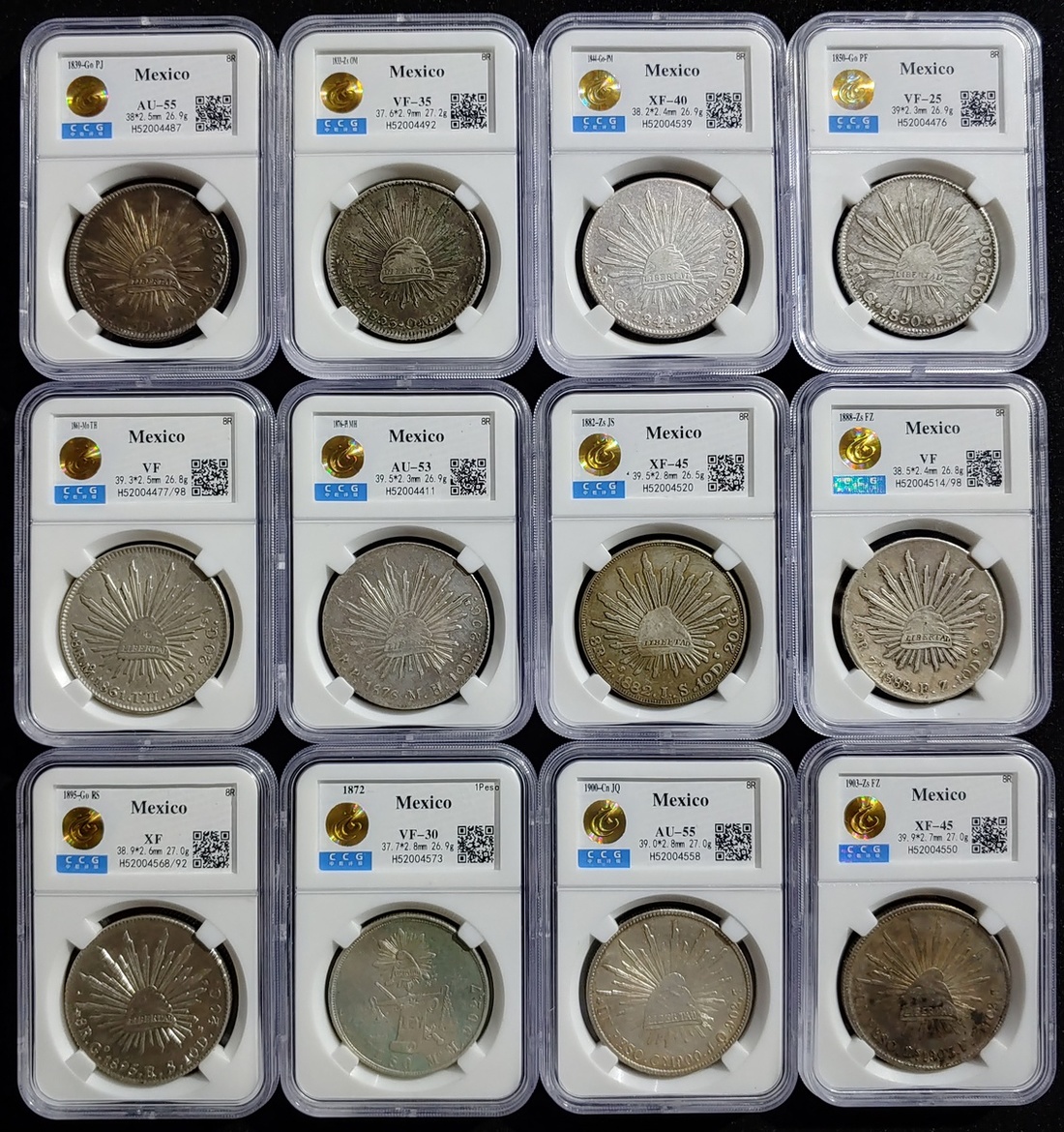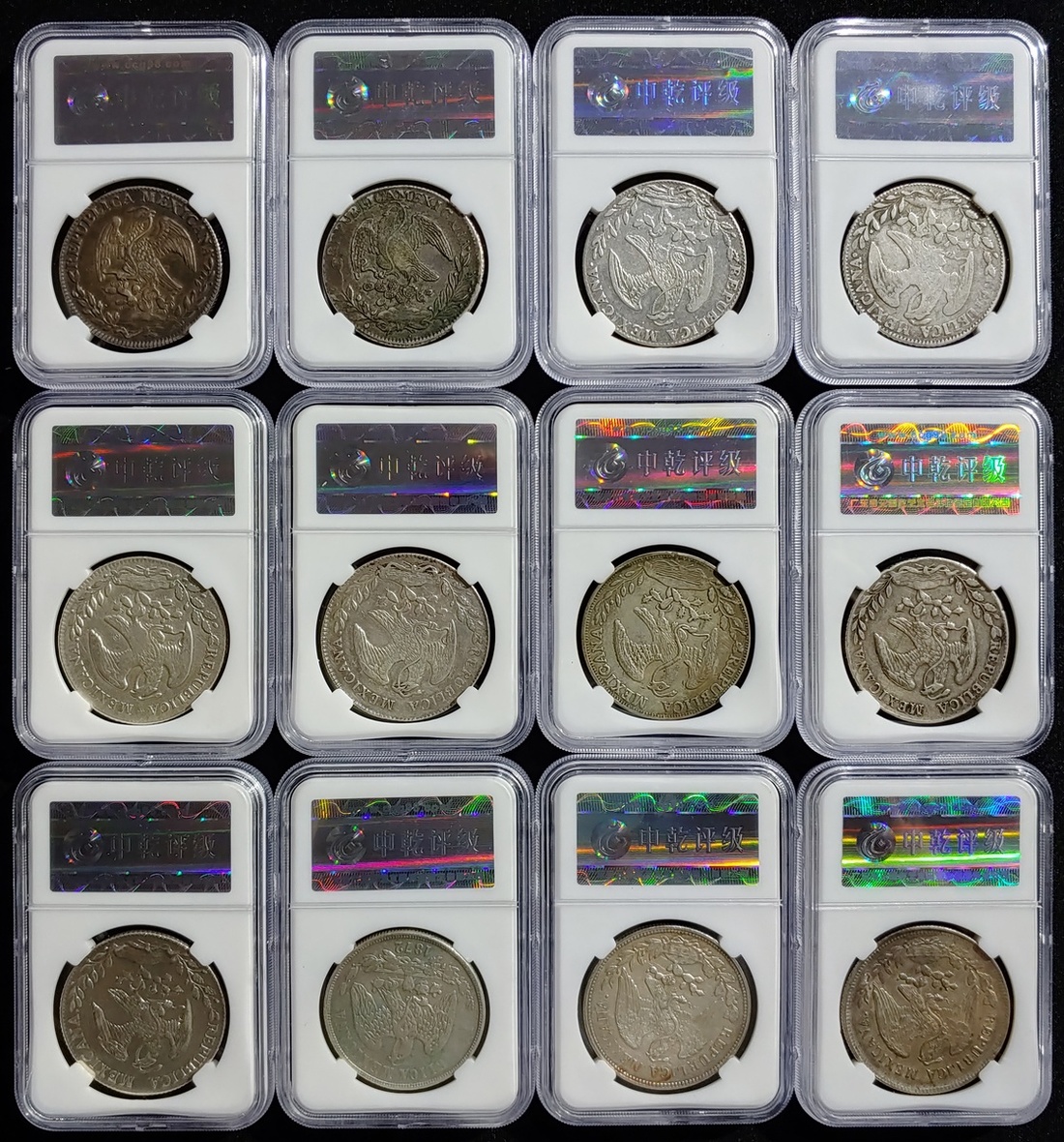 1833-1903年墨西哥八瑞爾鷹洋、壹比索銀幣一組十二枚,均中乾評級,敬請預覽(12)