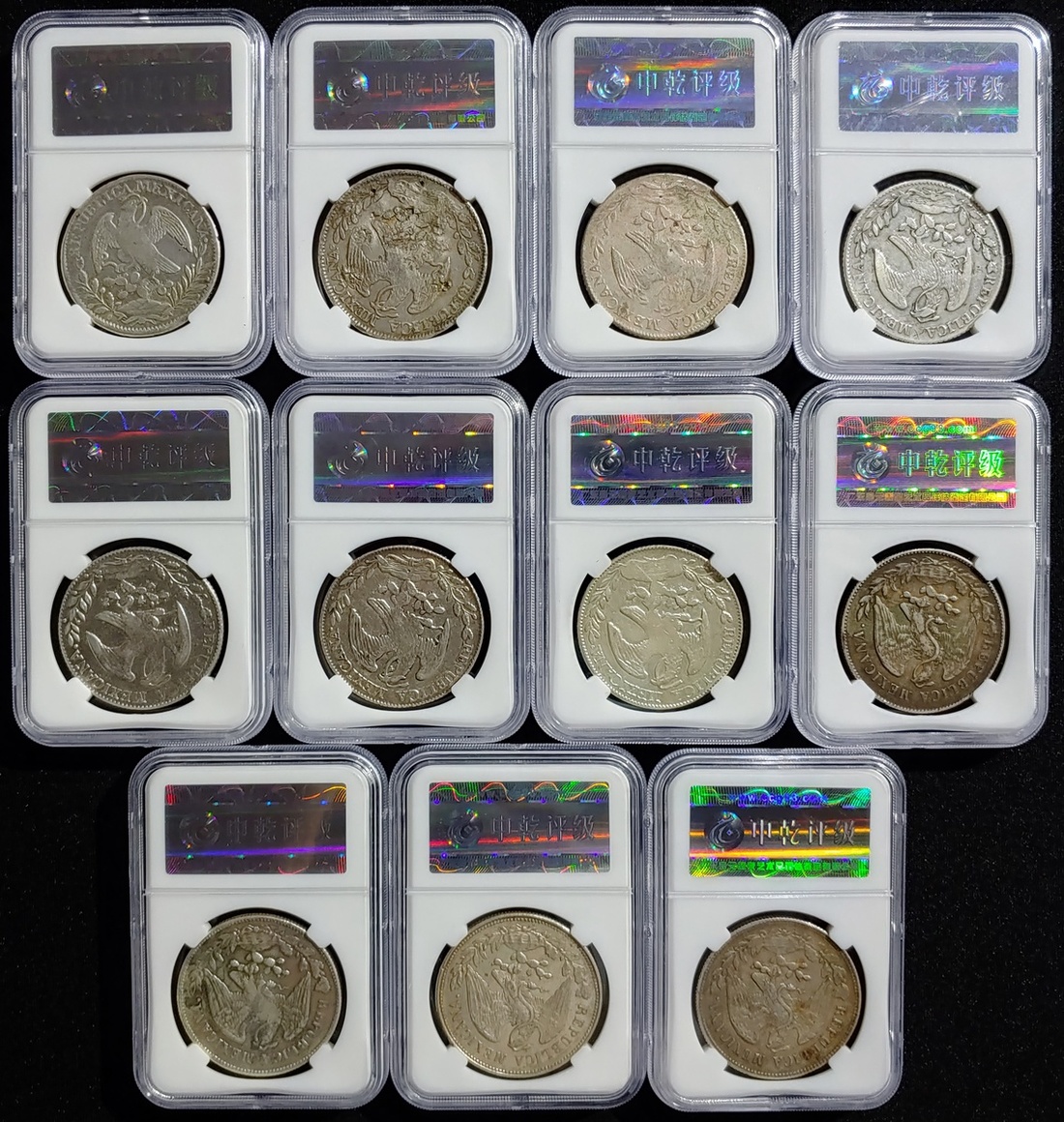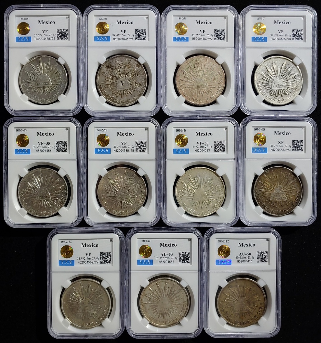1838-1901年墨西哥八瑞爾鷹洋、壹比索銀幣一組十一枚,均中乾評級,敬請預覽(11)