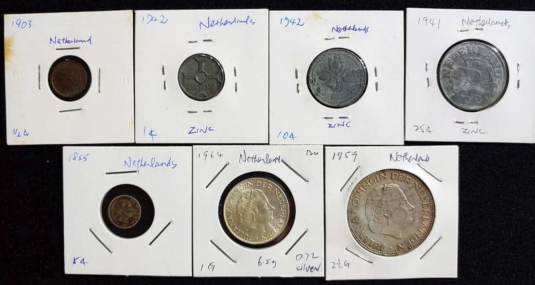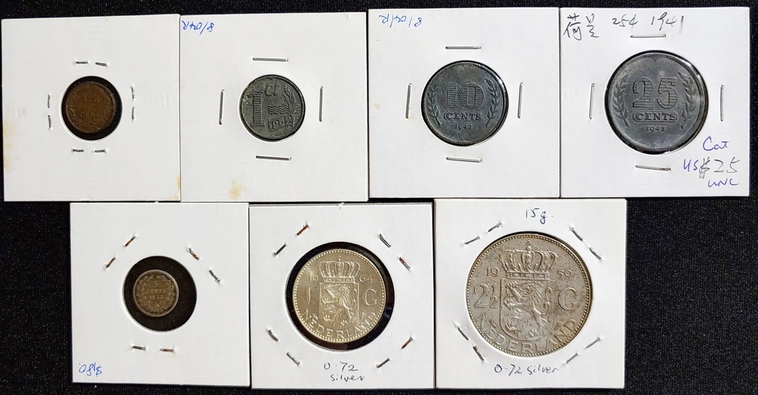 Netherlands, group of 7, consisting of: 1/2 cent, 1903, 1 cent, 1942, 5 cents, 1855, 10 cents, 1942, 25 cents, 1941, 1 gulden, 1964 and 2 1/2 gulden, 1959,