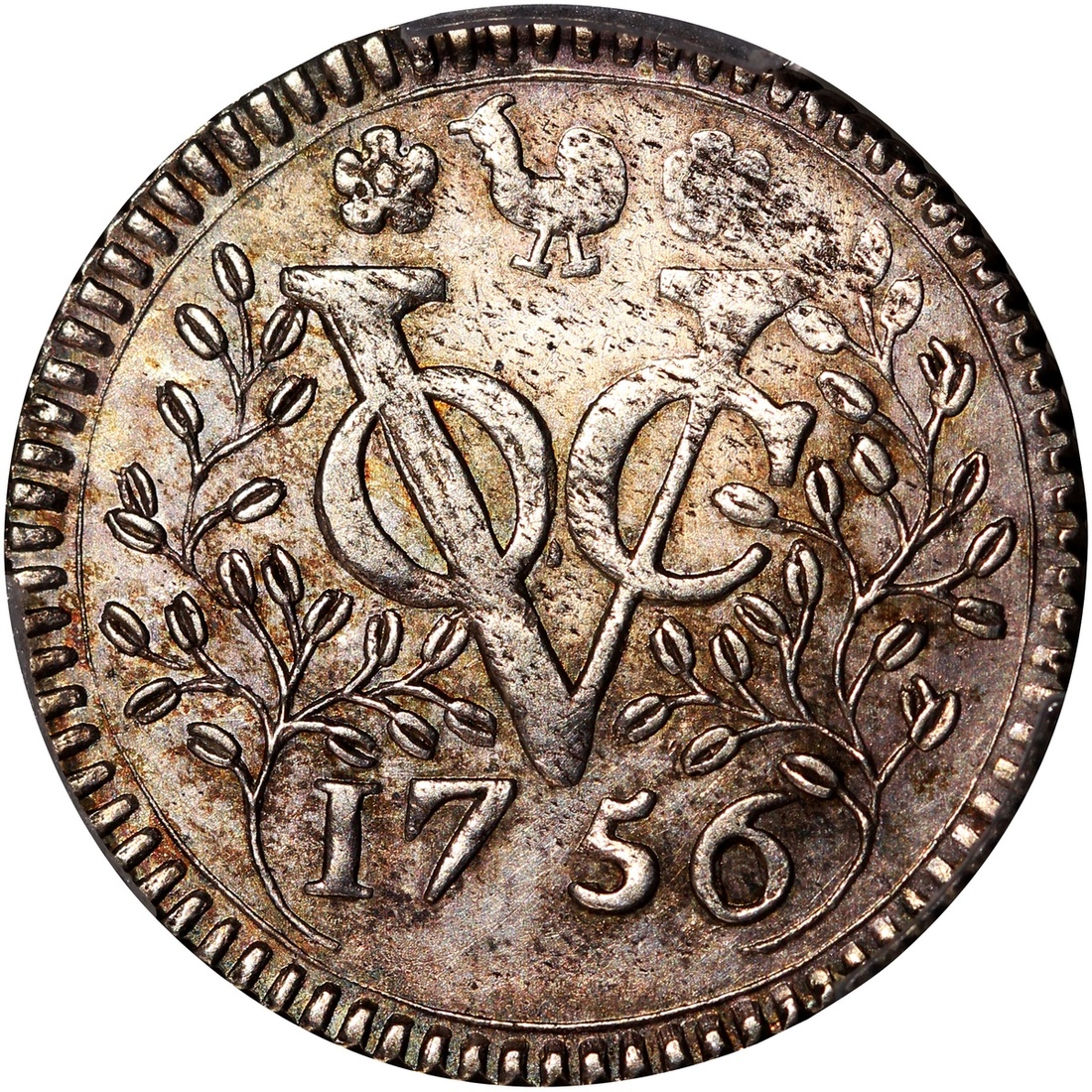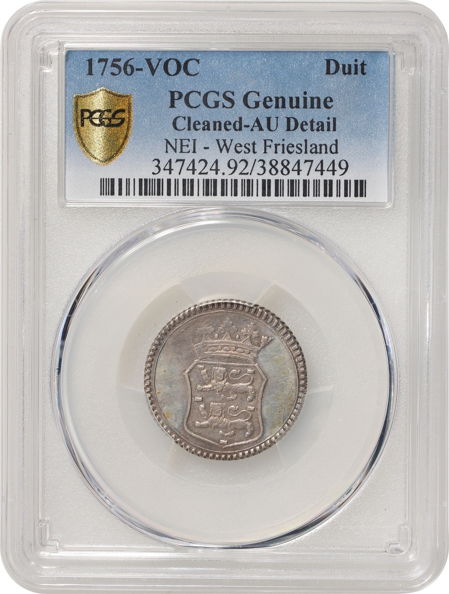 Netherlands East Indies, West Friesland, silver duit, special presentation strikes produced by mintmaster on demand, 1756 VOC, PCGS SP Genuine, AU Detail, cleaned. #38847449
