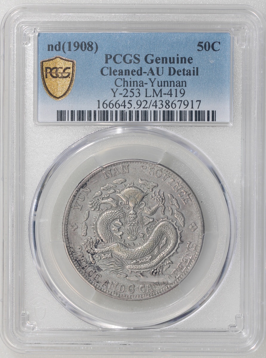 Yunnan Province, silver 50 cents, 1908, 'Guangxu Yuan Bao', (Y-253, LM-419), PCGS Genuine Cleaned - AU Detail, #43867917.