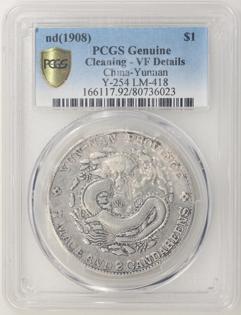 Yunnan Province, silver $1, ND (1908), 'Guangxu Yuan Bao', old dragon, (LM-418, Y-254), PCGS VF Details (Cleaning), Cert. #80736023