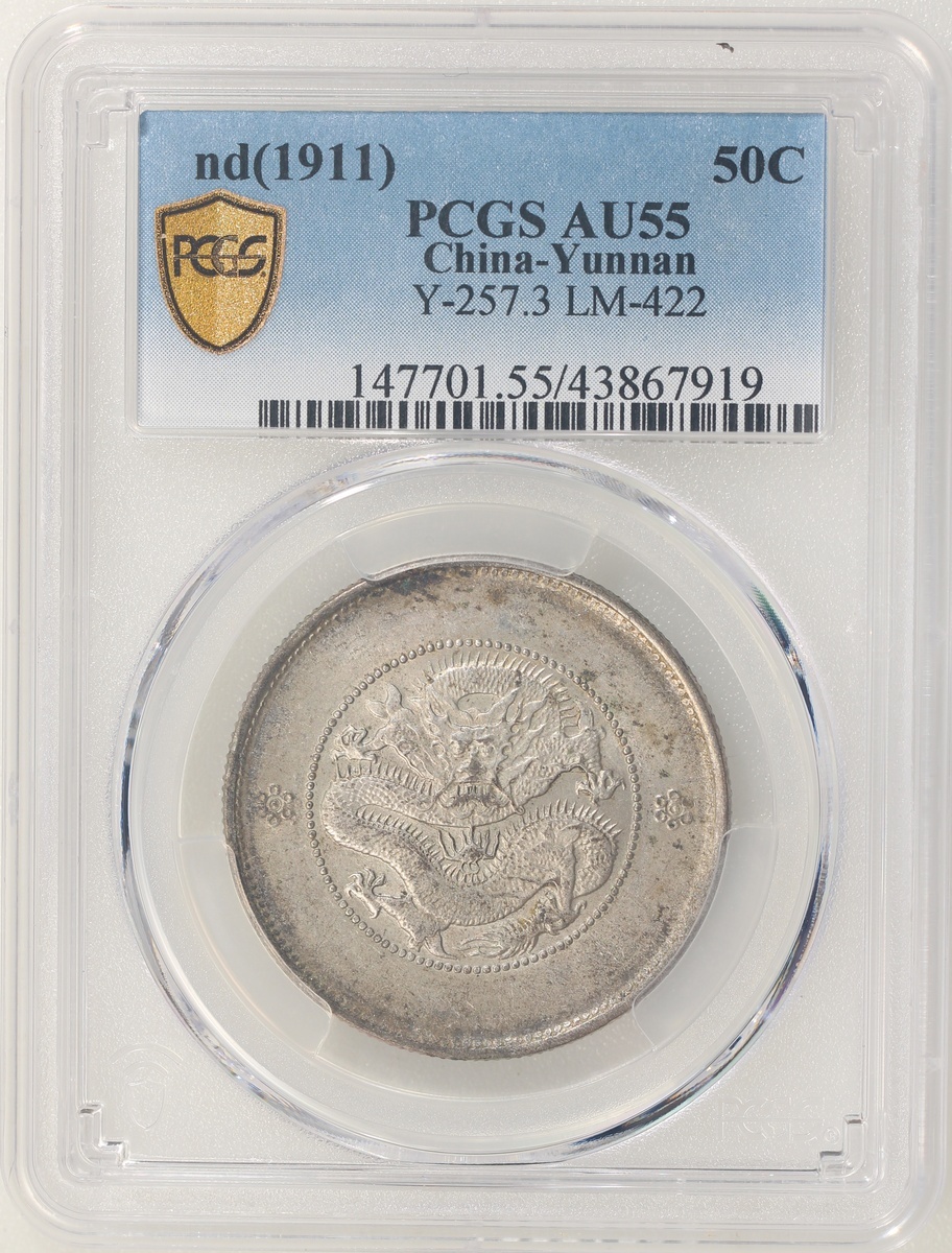 Yunnan Province, silver 50 cents, ND (1911), 'Guangxu Yuan Bao', new dragon, (Y-257.3, LM-422), PCGS AU55, #43867919.