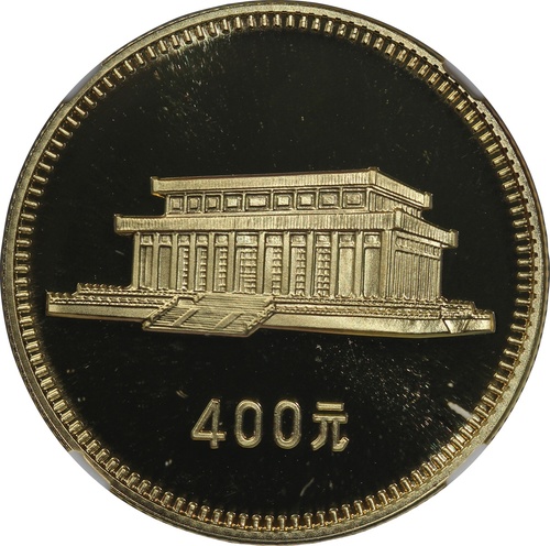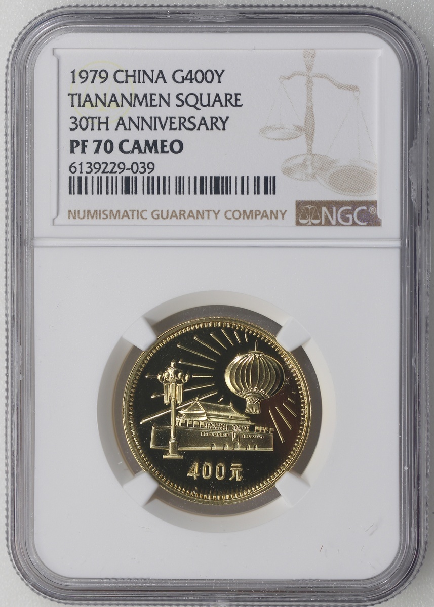 1979年中國精鑄金幣400元一組四枚,中華人民共和國成立三十週年紀念,包括「人民英雄紀念碑」,「天安門」,「毛主席紀念堂」及「人民大會堂」,總含金量2盎司,均評NGC PF70 Cameo,#6139229-038至#6139229-041,附原盒及證書,編號39674,發行70000套,一套頂尖評分佳品!