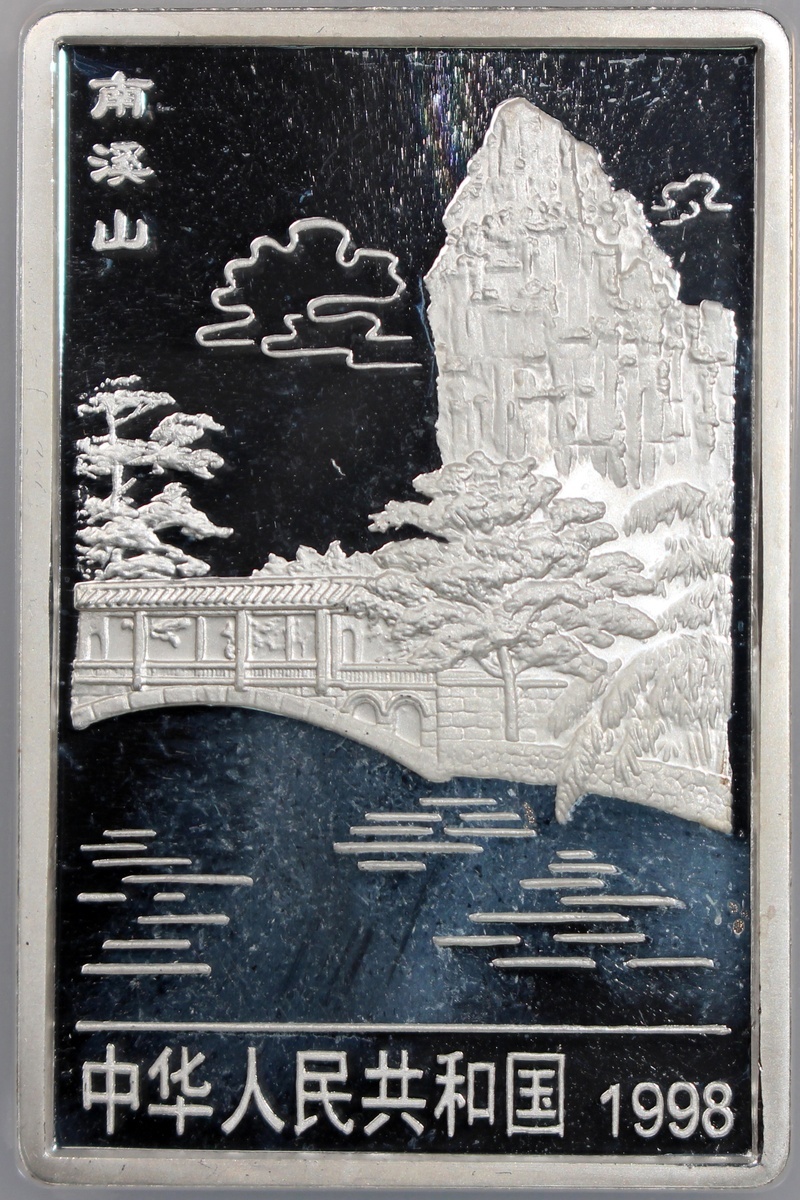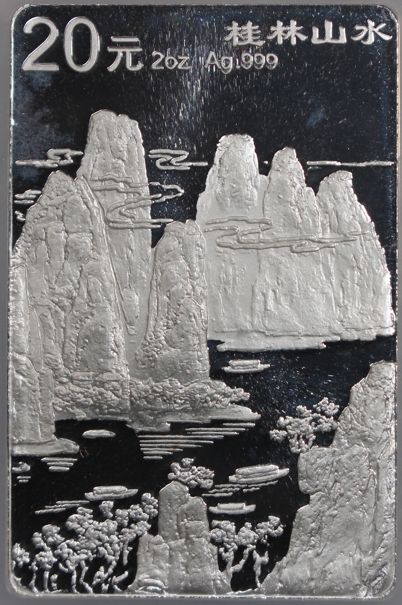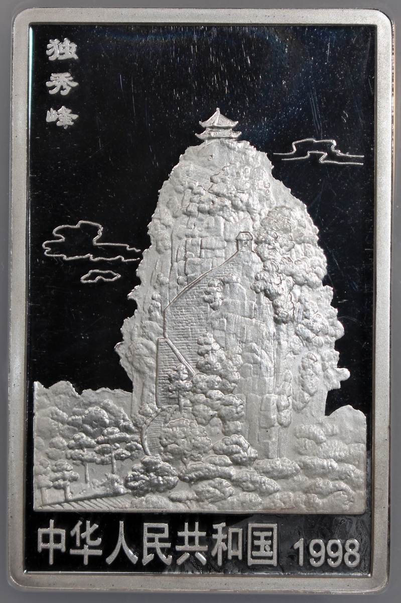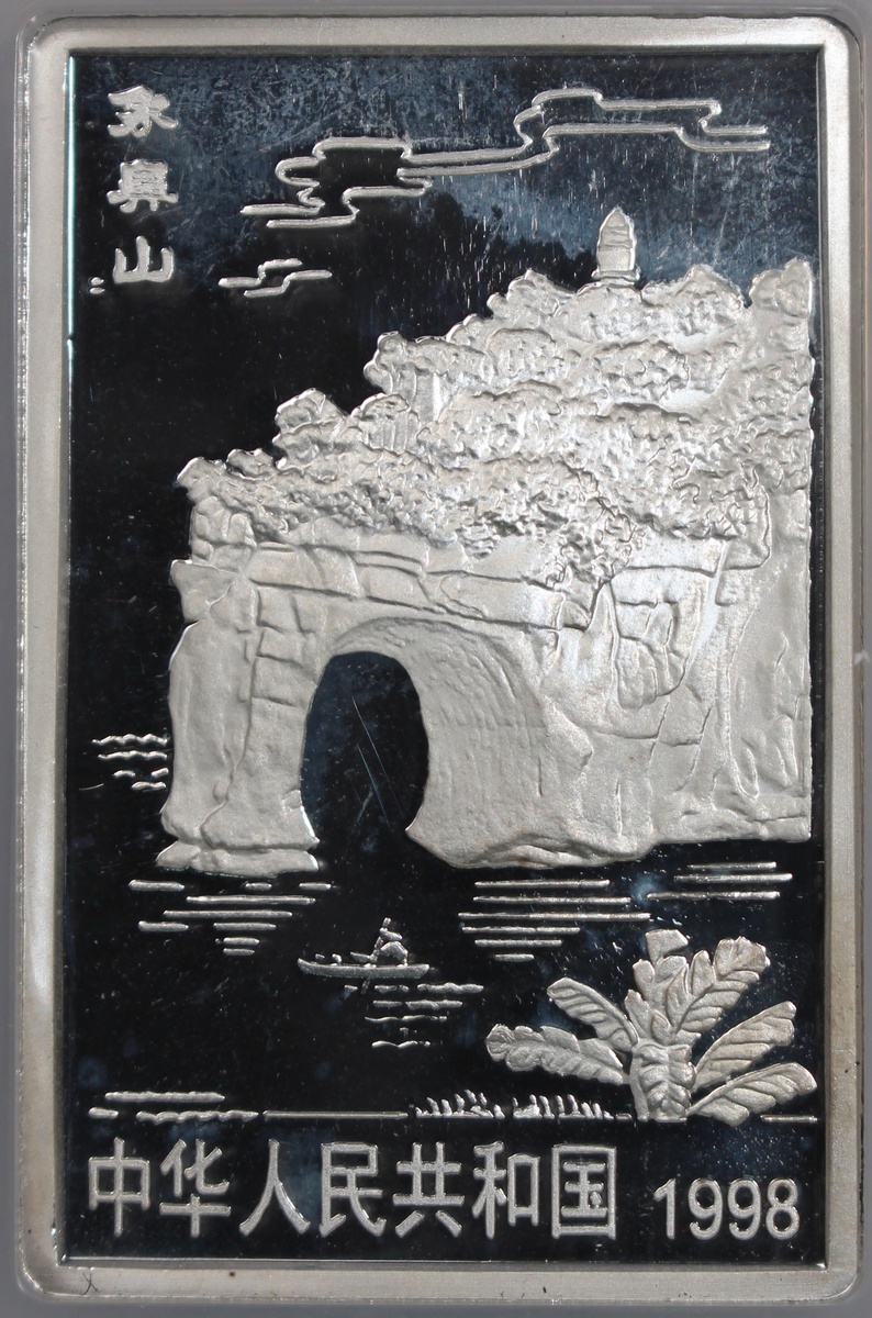 1998年中國桂林山水精鑄紀念銀幣20元一套4枚,「獨秀峰」,「南溪山」、「花橋」及「象鼻山」,總含銀量8盎司,附原盒及證書,計劃鑄造18800套,實際鑄造8000套,分別評NGC PF 68 Ultra Cameo,PF 66 Ultra Cameo,PF 69 Ultra Cameo及PF 66 Ultra Cameo,#6440809-016至6440809-019