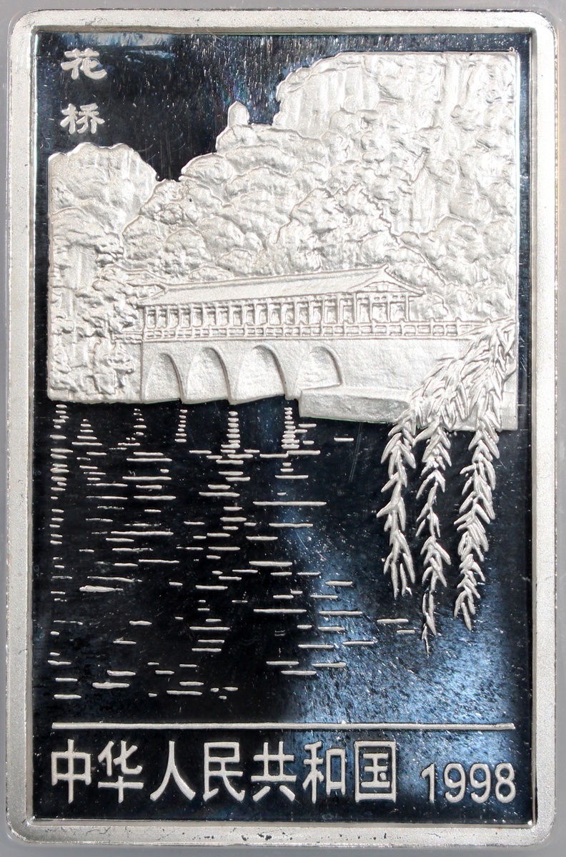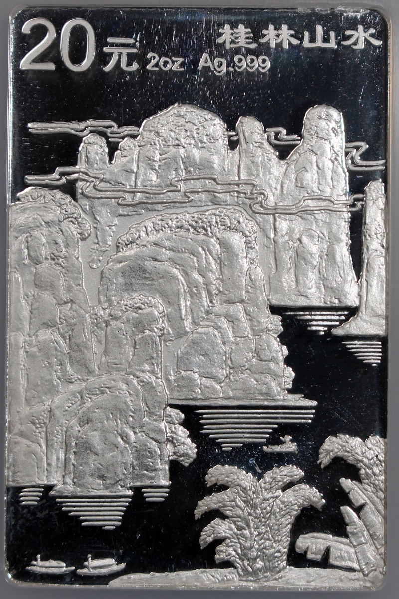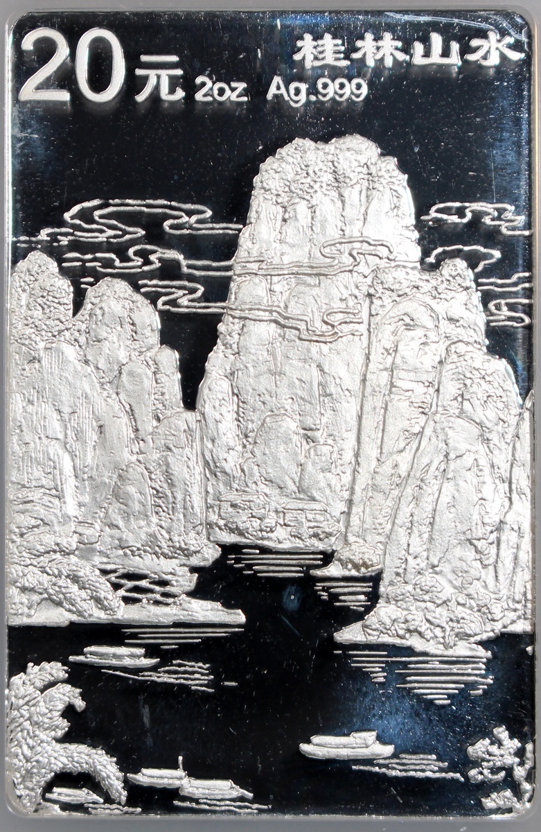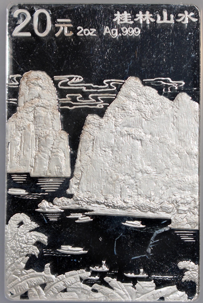 1998年中國桂林山水精鑄紀念銀幣20元一套4枚,「獨秀峰」,「南溪山」、「花橋」及「象鼻山」,總含銀量8盎司,附原盒及證書,計劃鑄造18800套,實際鑄造8000套,分別評NGC PF 68 Ultra Cameo,PF 66 Ultra Cameo,PF 69 Ultra Cameo及PF 66 Ultra Cameo,#6440809-016至6440809-019