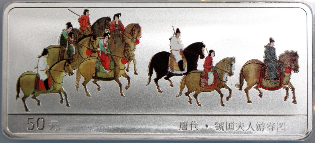 1999年中國彩色精鑄銀幣50元,「唐代虢國夫人游春圖」,總含銀量5盎司,附原盒及證書,NGC PF 69 Ultra Cameo,#6440809-021