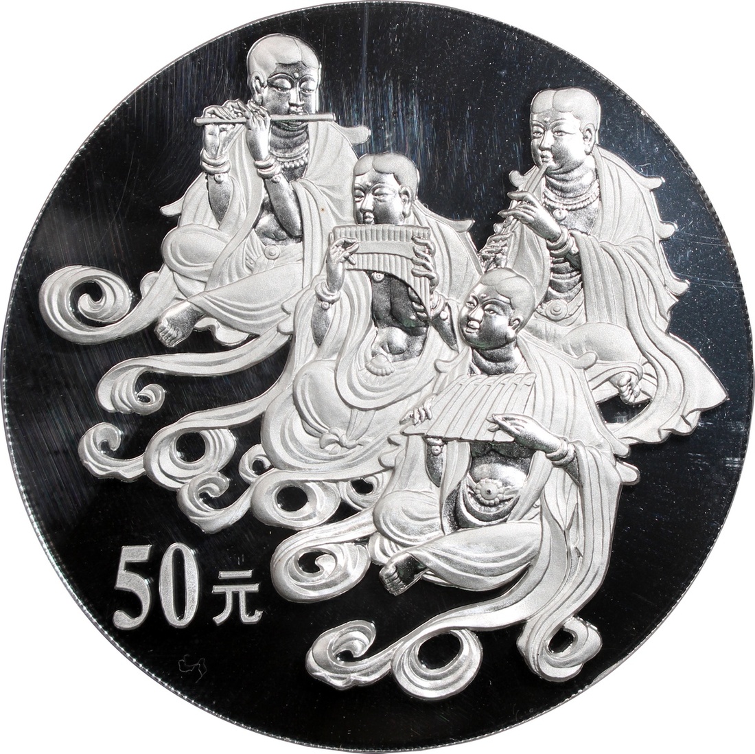 People's Republic of China, 1x silver proof 50 Yuan, 2001, Dunhuang, 'Musicians, Tang Dynasty Painting', total ASW 5oz, with original box and certificate of issue, mintage of 8000 pieces,