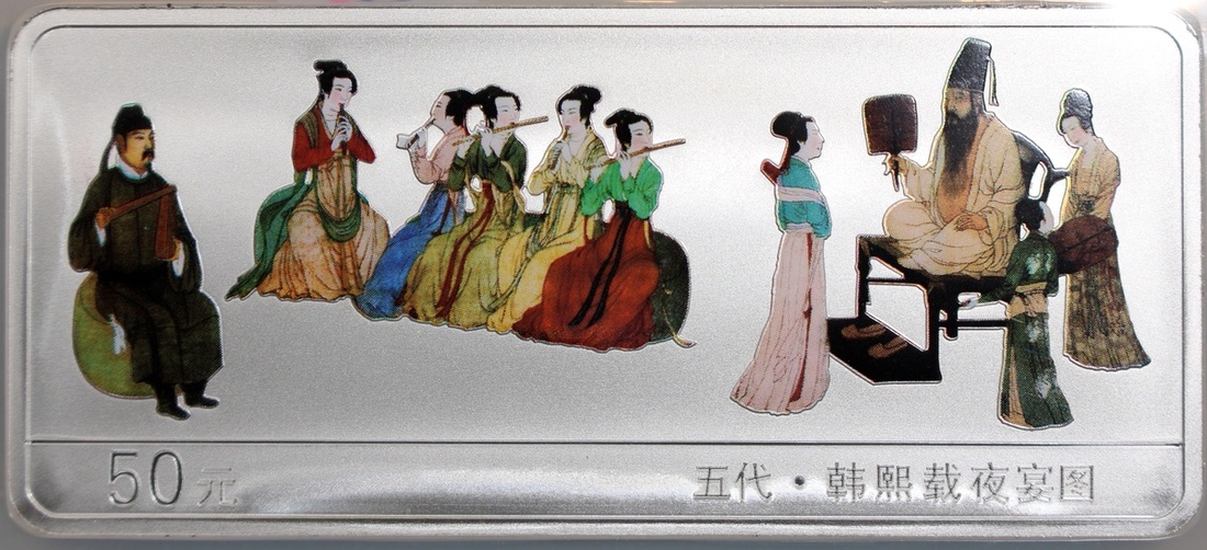 2001年中國彩色精鑄銀幣50元,「五代韓熙載夜宴圖」,總含銀量5盎司,附原盒及證書,NGC PF 69 Ultra Cameo,#6440809-039