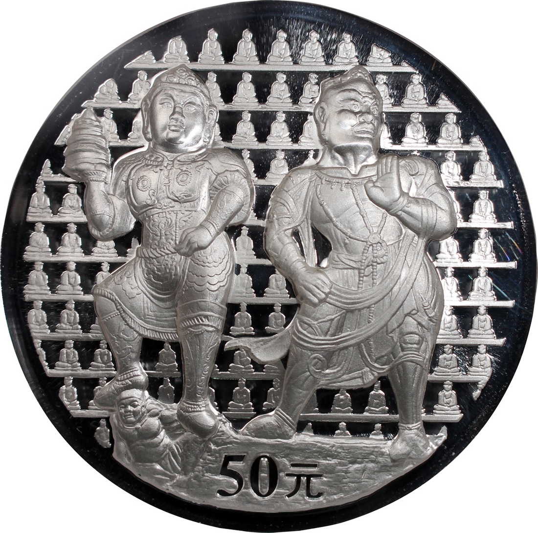 2002年中國石窟藝術-龍門精鑄銀幣50元,「天王、力士像圖」,總含銀量5盎司,附原盒及證書,發行8000枚,NGC PF 70 Ultra Cameo,#6440809-043