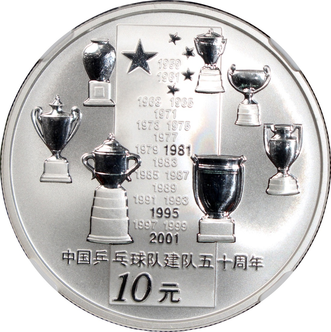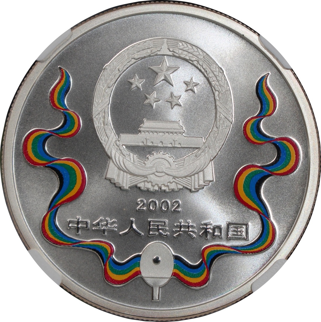2002年中國精鑄彩色銀幣10元,「乒乓球隊建隊五十周年」,重1盎司含.999銀,附原盒及證書,NGC PF69,#6342453-045