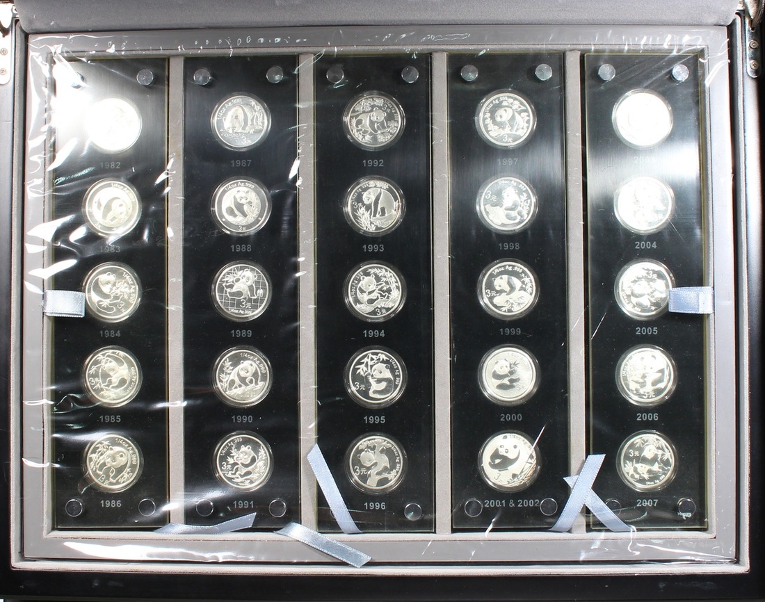 1982-2007年中國精鑄銀幣3元一套25枚,熊貓幣發行二十五週年紀念,總含銀量6.25盎司,附原盒及證書