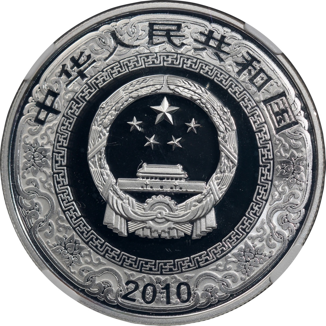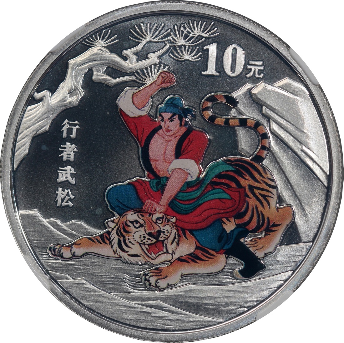 2010年中國水滸傳系列第二組彩色精鑄銀幣10元2枚一組,「楊志賣刀」及「武松打虎」,各重1盎司,總含銀量2盎司,附原盒及證書,與第一組及第三組證書編號相同,分別評NGC PF 69 Ultra Cameo及68 PF Ultra Cameo,#6469573-022,-025