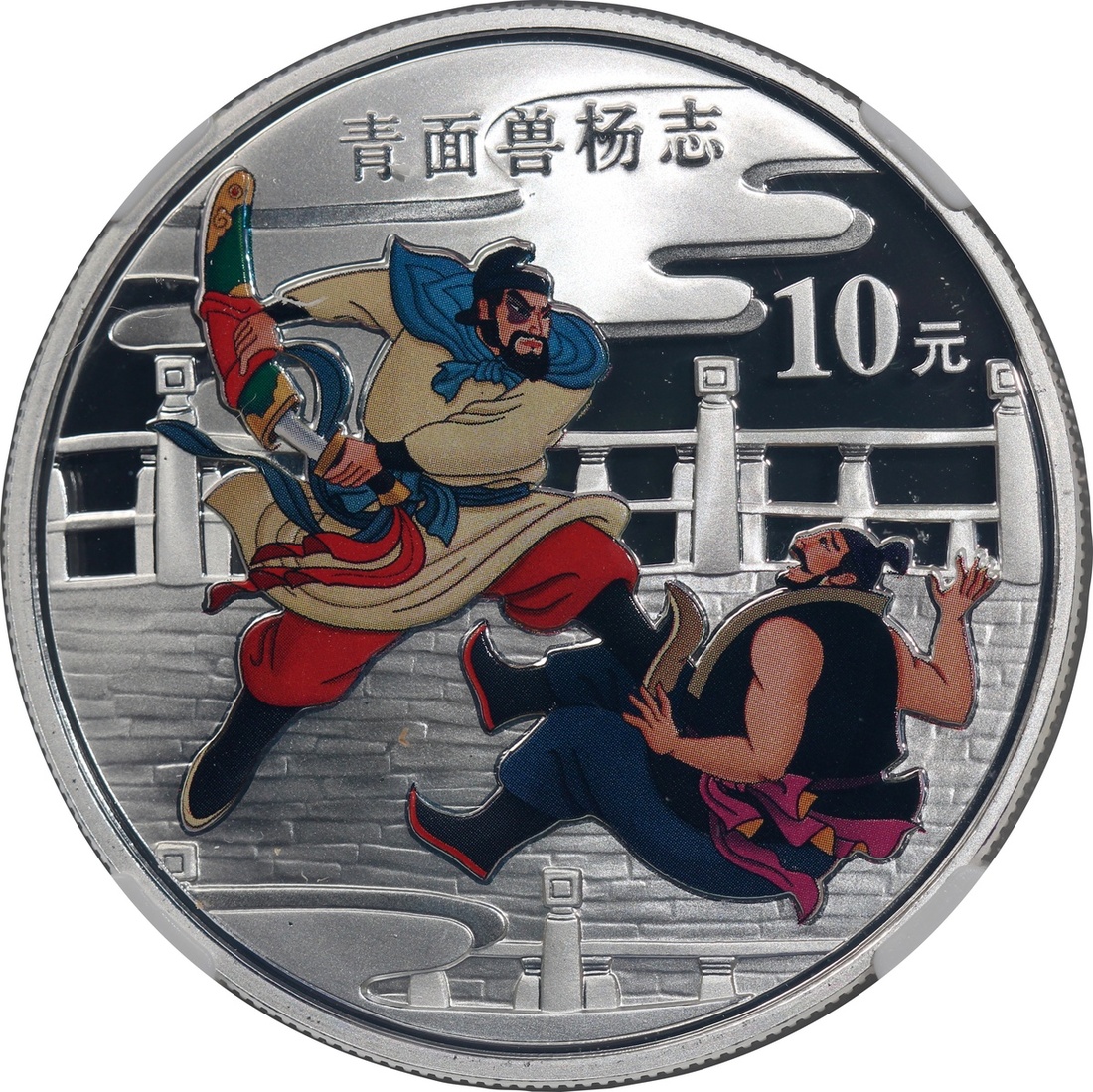 (x) People's Republic of China, set of 2x coloured silver proof 10 yuan, 2010, Outlaws of the Marsh Series II, 'Yang Zhi' and 'Wu Song', each weighing 1oz, total ASW 2oz, with original packaging and certificate, same serial as Series I and Series III, graded NGC PF 69 Ultra Cameo and 68 PF Ultra Cameo, Cert. #6469573-022, -025 (1 box of 2 coins)