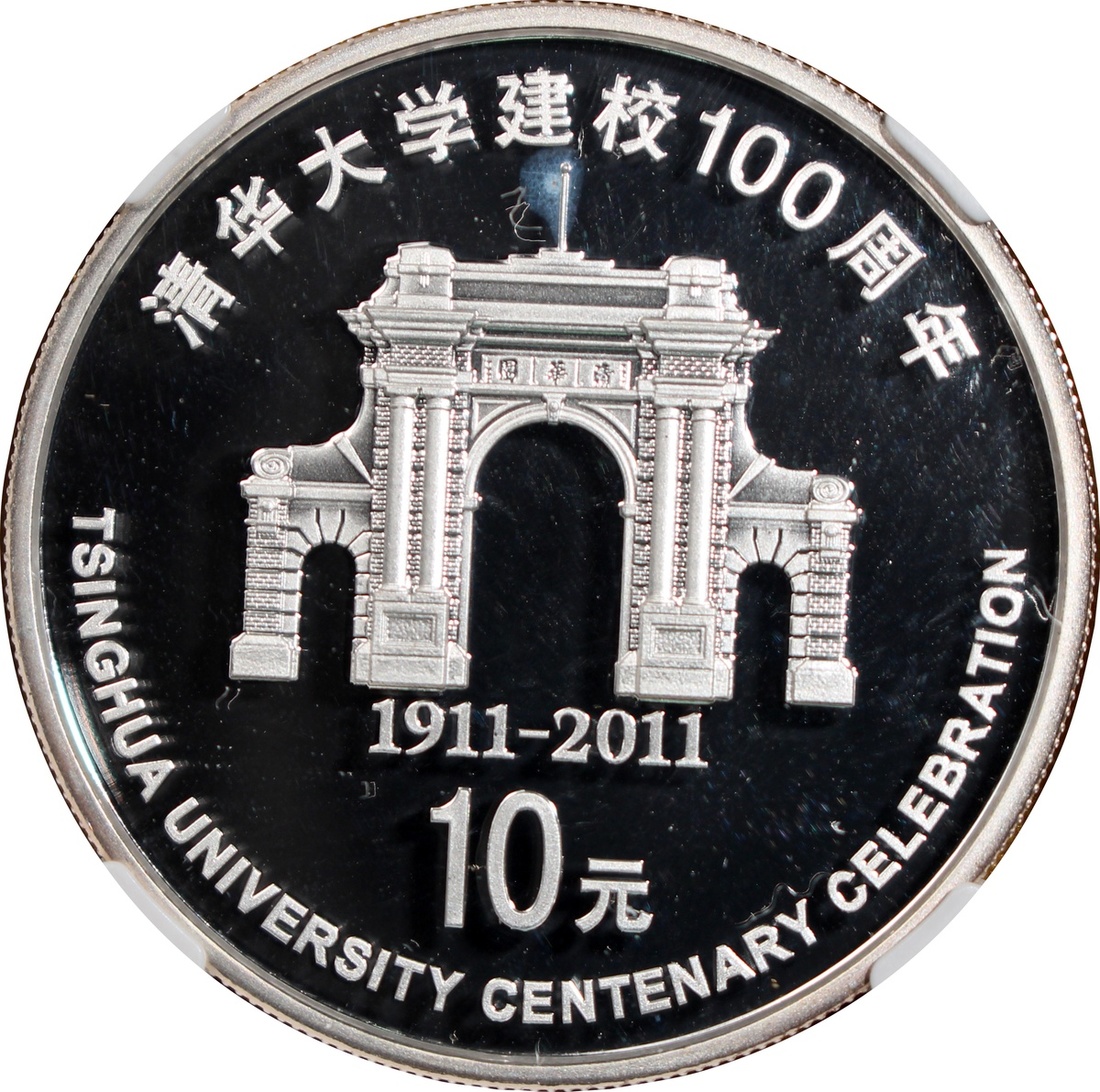 2011年中國清華建校一百周年精鑄紀念精鑄金銀幣,包括10元銀幣及100元金幣,重1盎司及0.25盎司,銀幣評NGC PF68 Ultra Cameo,金幣PF70 Ultra Cameo,附原盒及證書