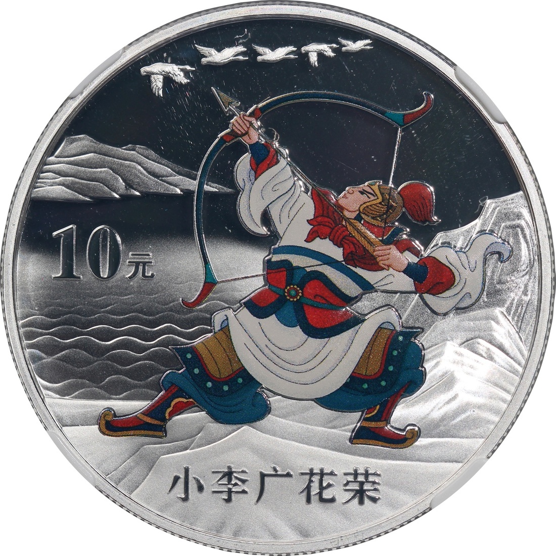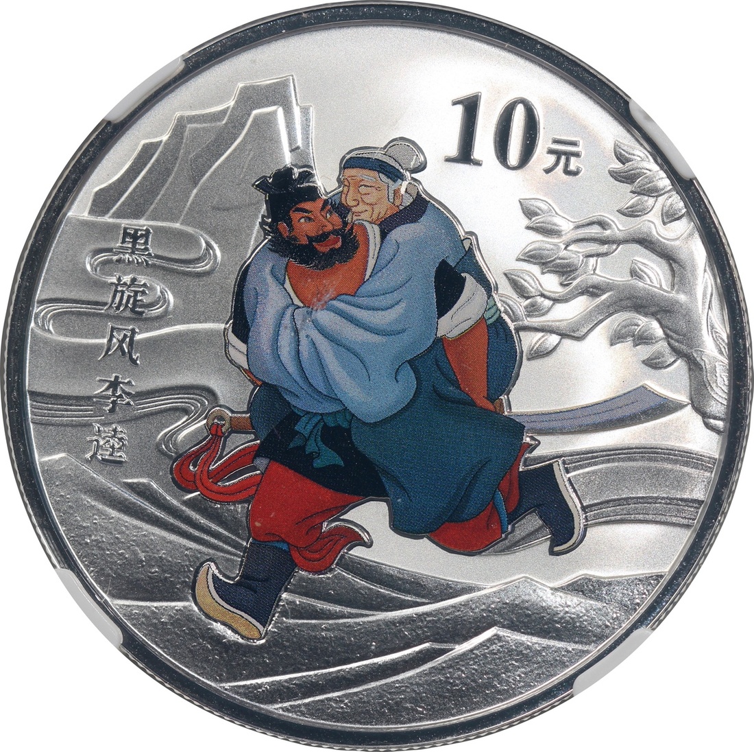 2011年中國水滸傳系列第三組彩色精鑄銀幣10元2枚,「黑旋風李逵」及「小李廣花榮」,各重1盎司,總含銀量2盎司,附原盒及證書,與第一組及第二組編號相同,分別評NGC PF 70 Ultra Cameo及69 PF Ultra Cameo,#6469573-028及-029