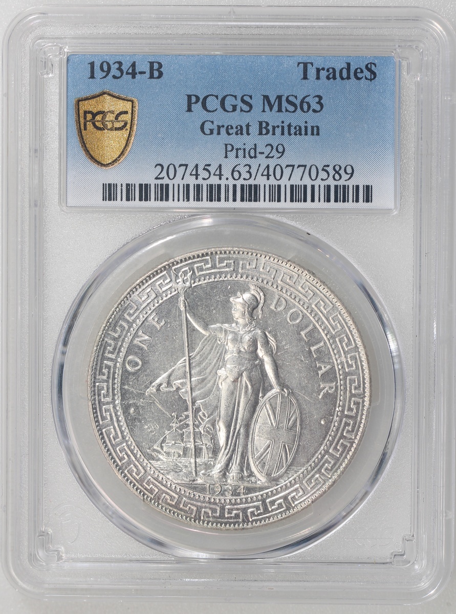 Great Britain, silver trade dollar, 1934-B, PCGS MS63 #40770589. A very scarce date with almost proof like fields. A few hairlines distracts the coin from achieving the higher grades but definitely a true collector's coin. Rarely offered