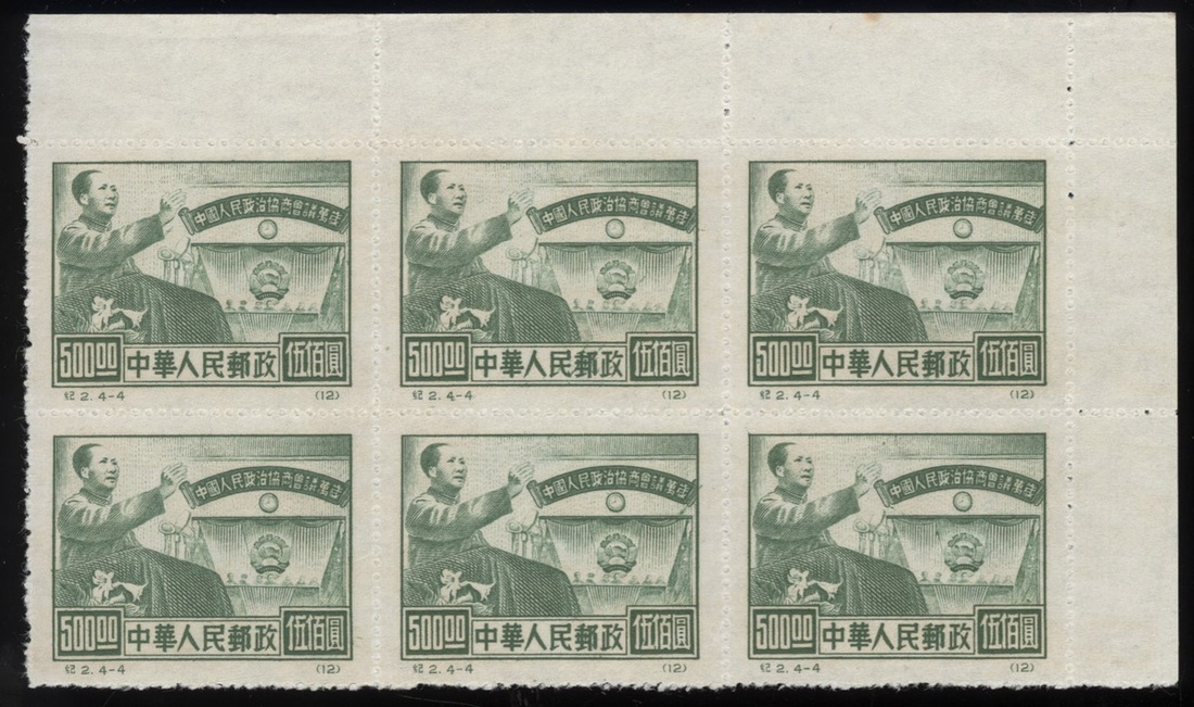 1950 (1 Feb.) Chinese People's Political Conference (C2), $50 to $500 complete set of four in block of six with corner margin, fine. Yang C9-C12